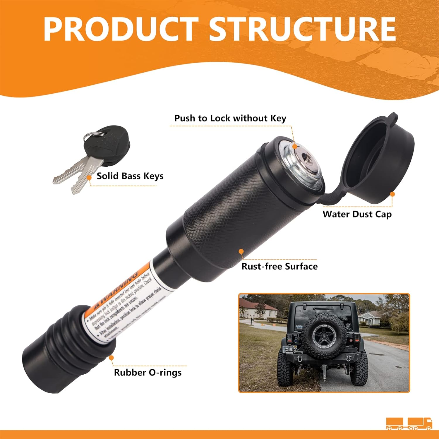 - 【PUSH-TO-LOCK DESIGN】- Solid hitch lock is designed for easy operation. With the push-to-lock design, you can easily push to lock it without using key. Just turn the key a little bit and the locking hitch pin will pop out by itself.