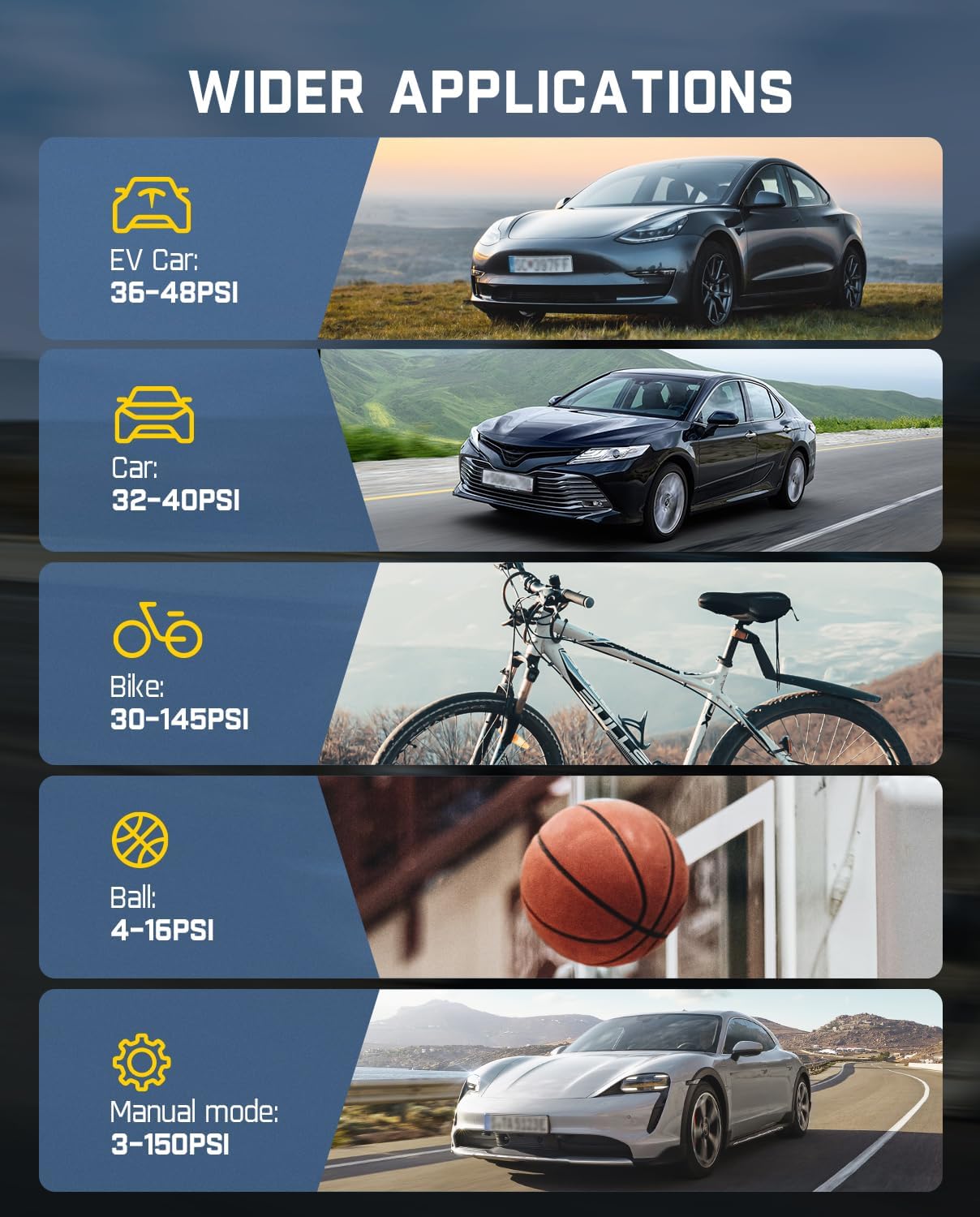 - Powerful Battery Life: With our innovative proprietary cooling function, it can continuously pump 15 Tesla car tires without pausing (36-42 PSI). Not need to wait for cooling