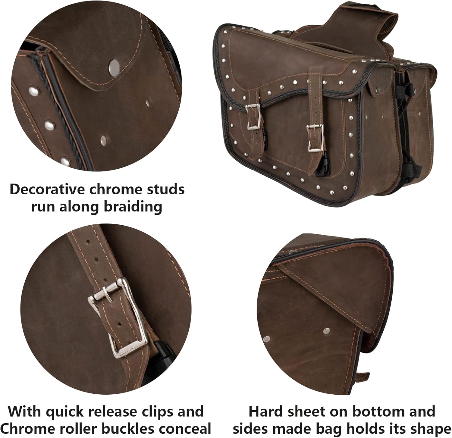 - 【Leather Material】This motorcycle saddlebags is made up of soft and durable heavy-duty leather. The reinforced sewing and moderate thickness make our motorcycle saddle bag can always keep its shape and longer service life.