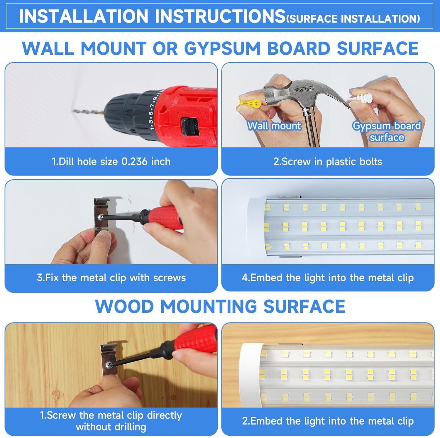 - 【Hanging or Surface Mount】- With Hanging & Ceiling Clips. You can easily flush mount the 8ft shop light to install it or hang to ceiling. You are free to connect the power by providing a power cord or just hardwiring it. You are also free to connect the lights together by the ends or with the provided 2-end extension cord. The 8FT led light is widely used in garage, workbench, basement, workshop, warehouse, barn, office, library, etc