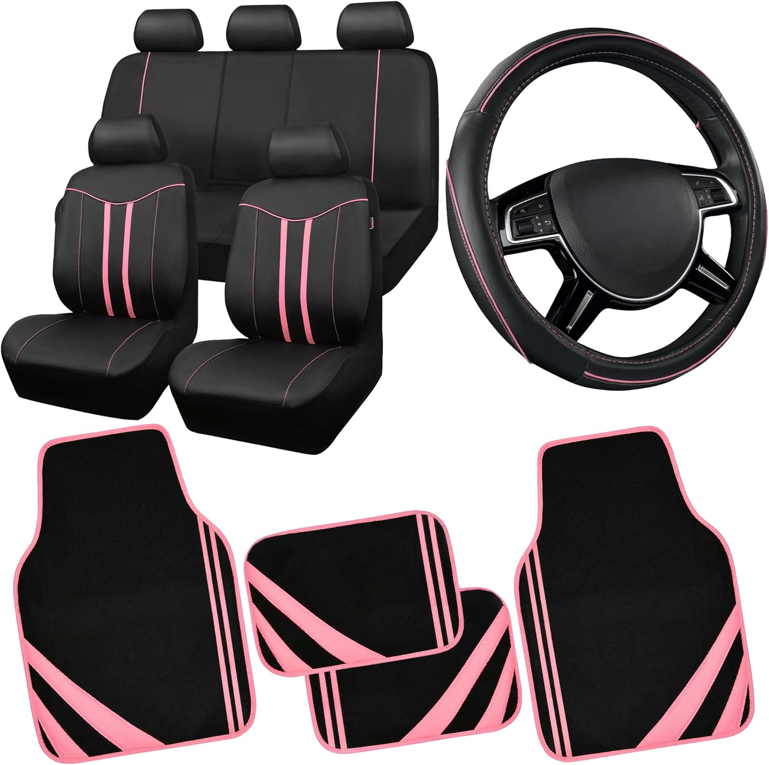 CAR PASS Car Seat Covers Full Set for Women Girls with Waterproof Car Floor Mats,Anti-Slip Leather Steering Wheel Cover,Universal Fit for SUVs,Vans,Trucks,Sedans,Cars (Combo Set,Black & Pink)