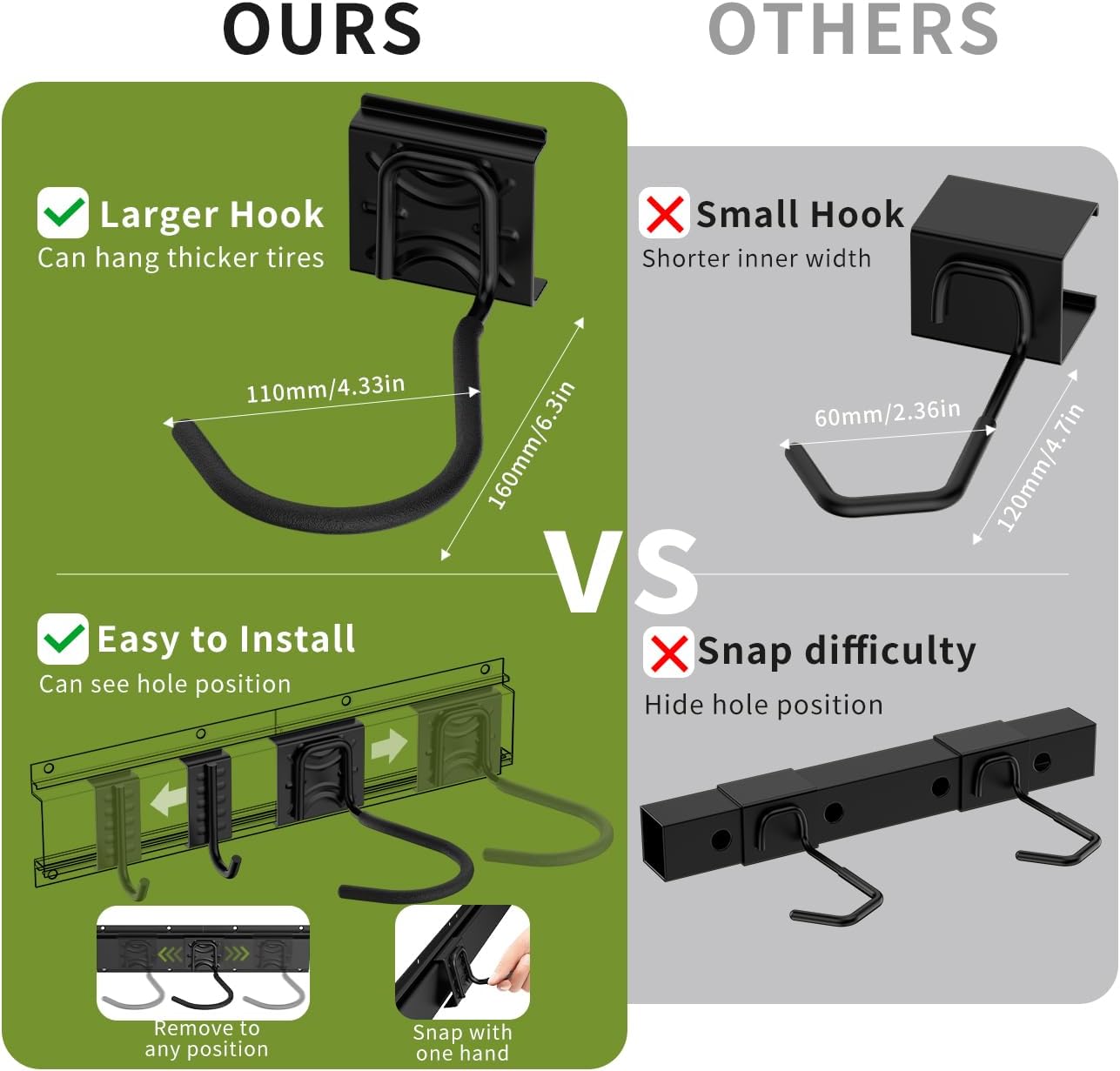 - 【Upgraded Large J-Hooks】 3*6.3*4.3in/75*160*110mm product size. Coated with rubber, the wide and sturdy wall hooks prevent bikes from scratching or sliding, allowing to carry wheel/tire up to 5in/12.7cm, while regular wall hooks are only 2/3 of the size of ours. And each hook can carry bike up to 75lbs. Tips: Not suitable for heavy duty e-bikes!