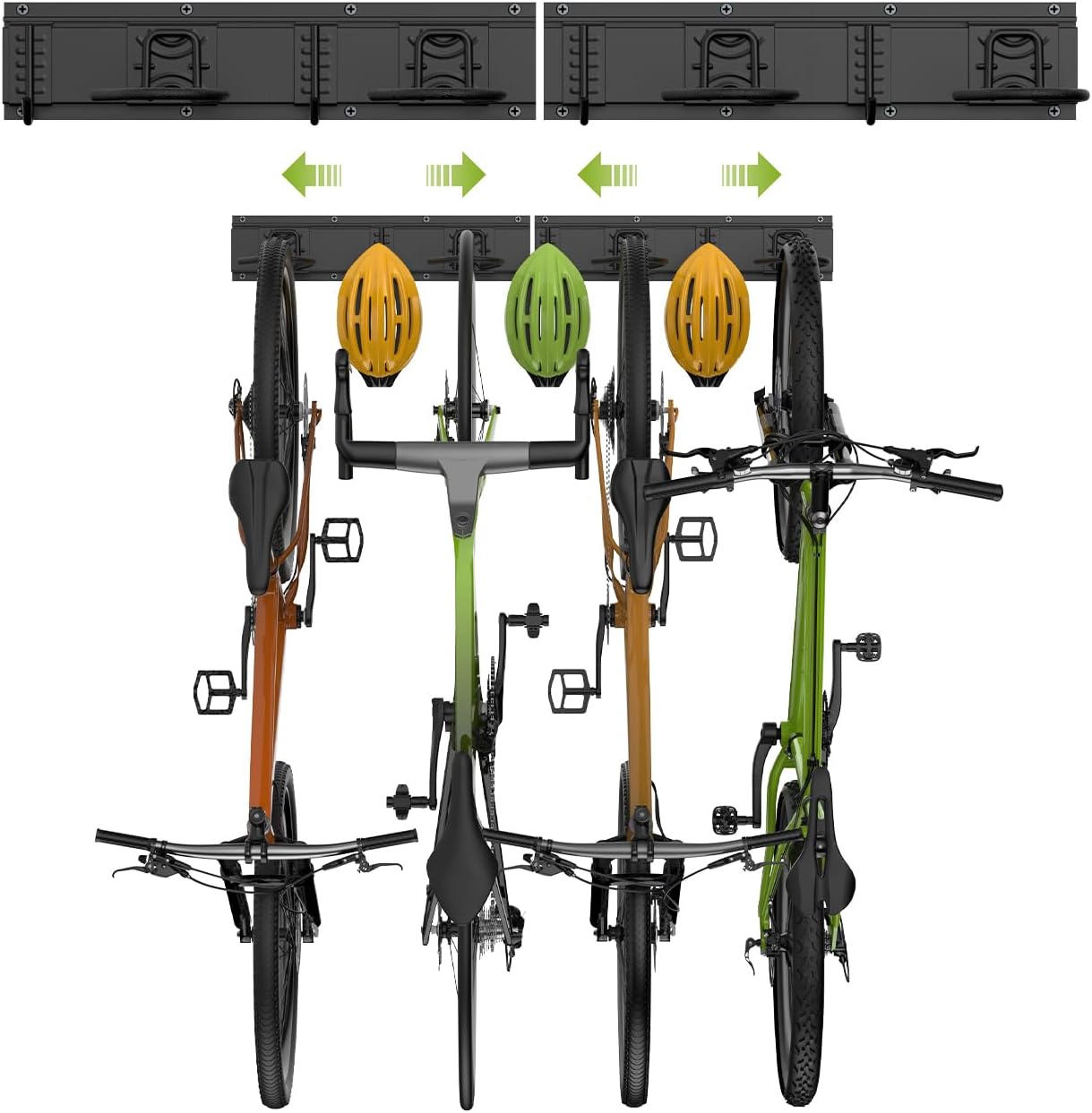 - 【Heavy-Duty Bicycle Hooks】 Made of sturdy industrial steel with a durable powder coat, which prevents rust and lasts for a lifetime. The bike hanger can hang up to 4 bikes and 3 helmets when installed correctly, holding up to 300lbs. The sturdy and safe hook design ensures that your bikes are wall mounted securely and won't accidentally fall off, perfect for garage storage.