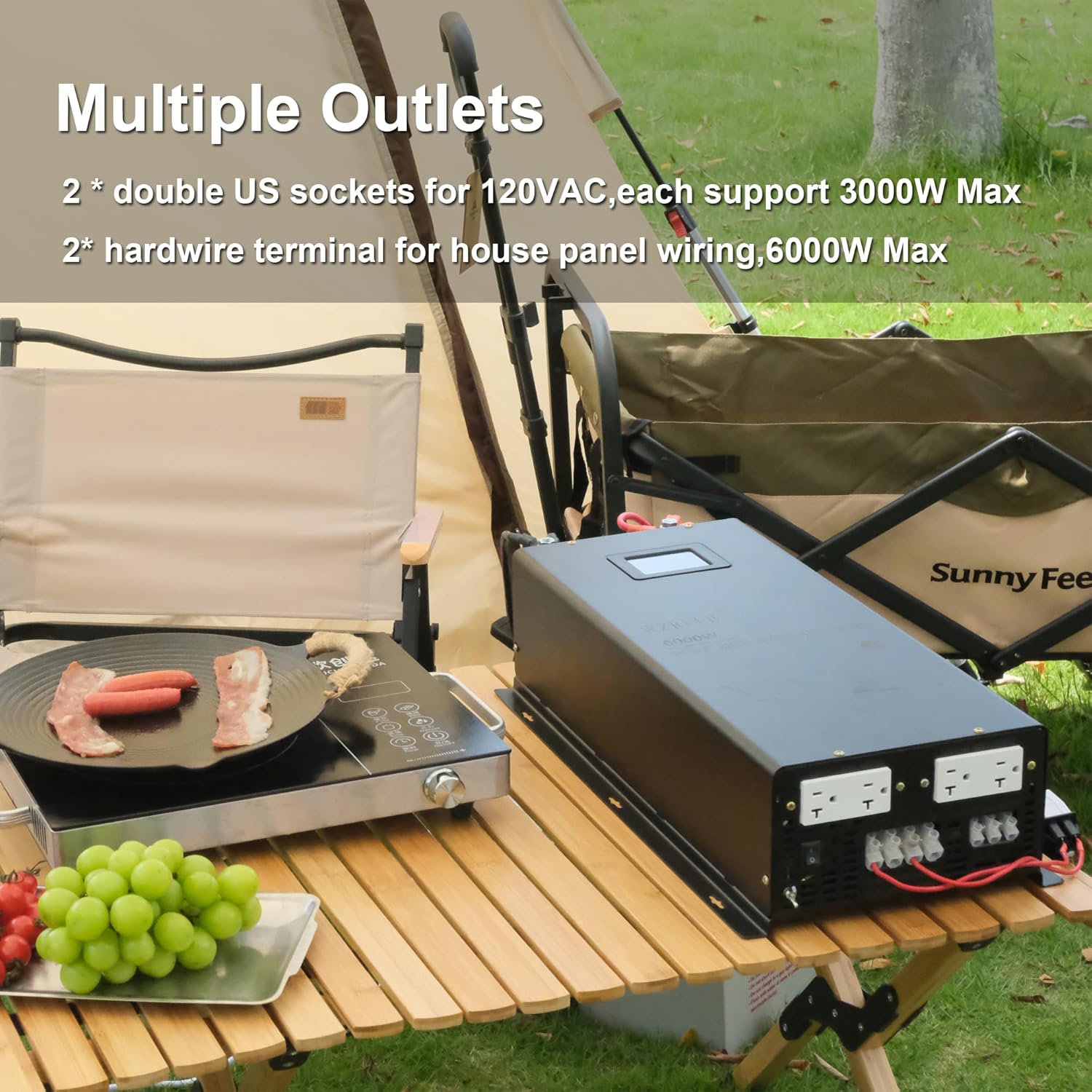 - POWERFUL: 6000 watts continuous, 12000 watts peak power, 48 volt DC to 120V 240V AC split phase true sine wave inverter, built-in soft starter, high frequency design with high surge capability to power demanding loads like air conditioner, refrigerator, power tools, and more