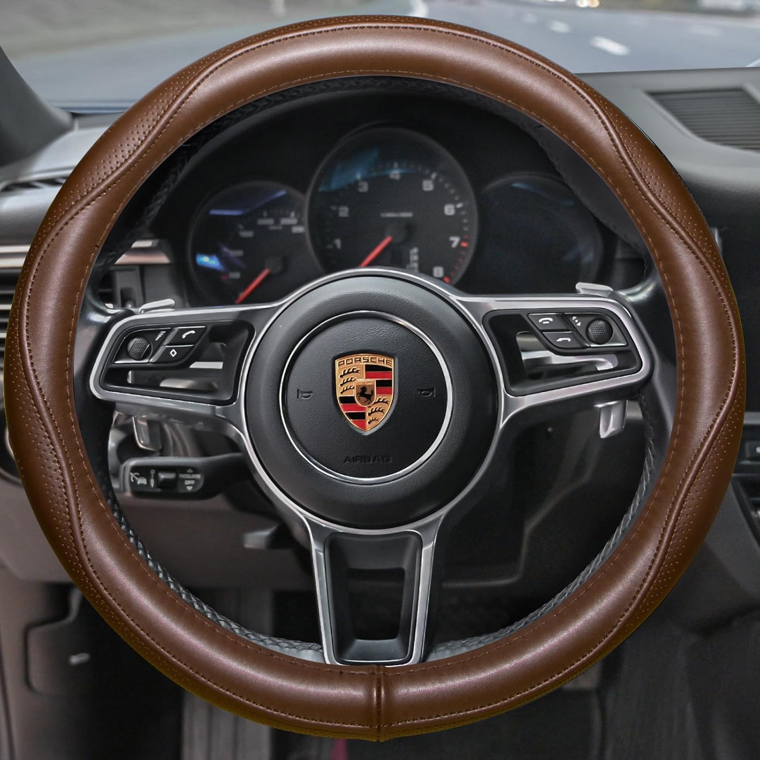 - TOP QUALITY : This Heavy Duty car brown steering wheel cover is made of cowhide, natural, skidproof, stable. The entire steering wheel has only one interface!