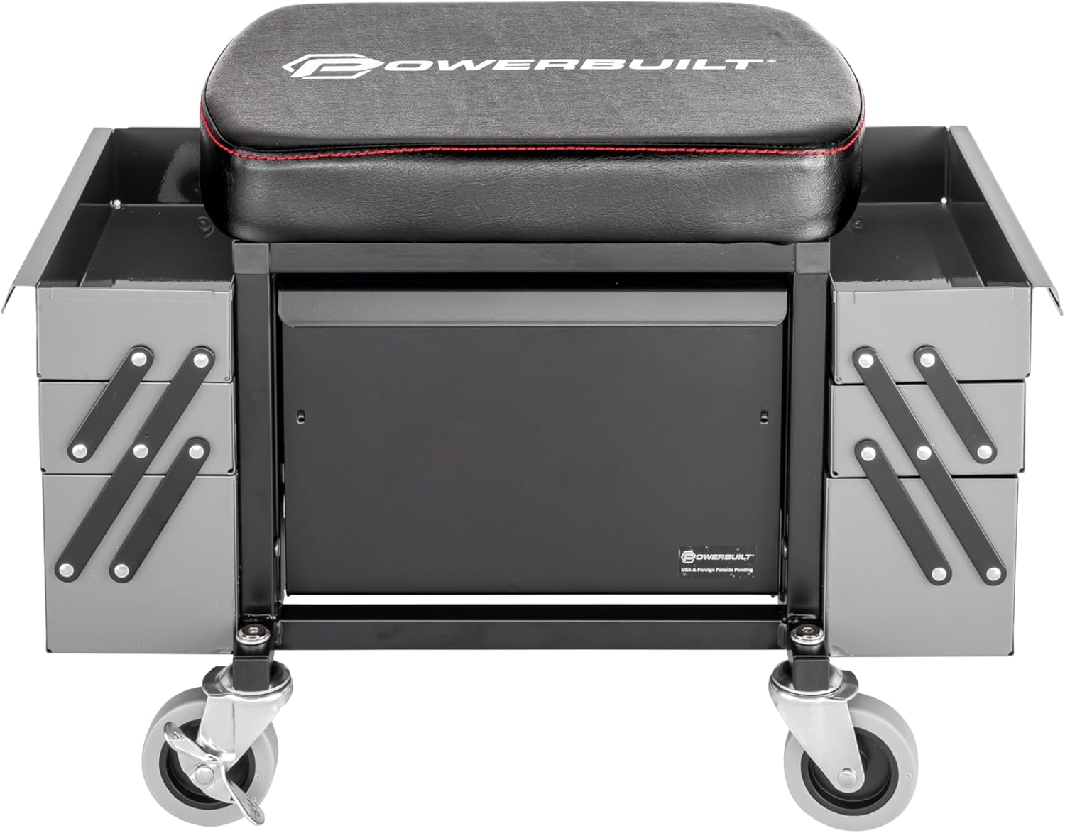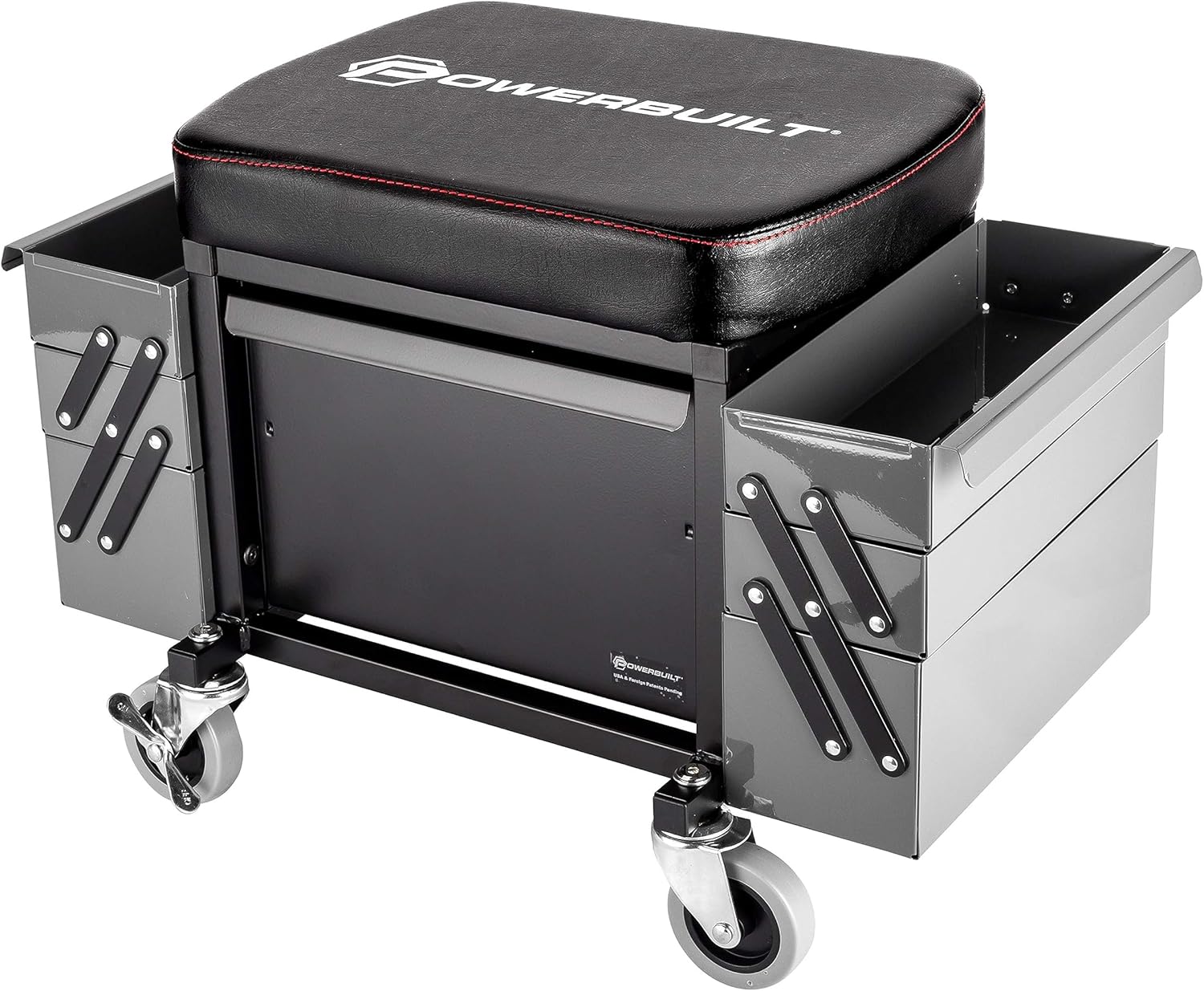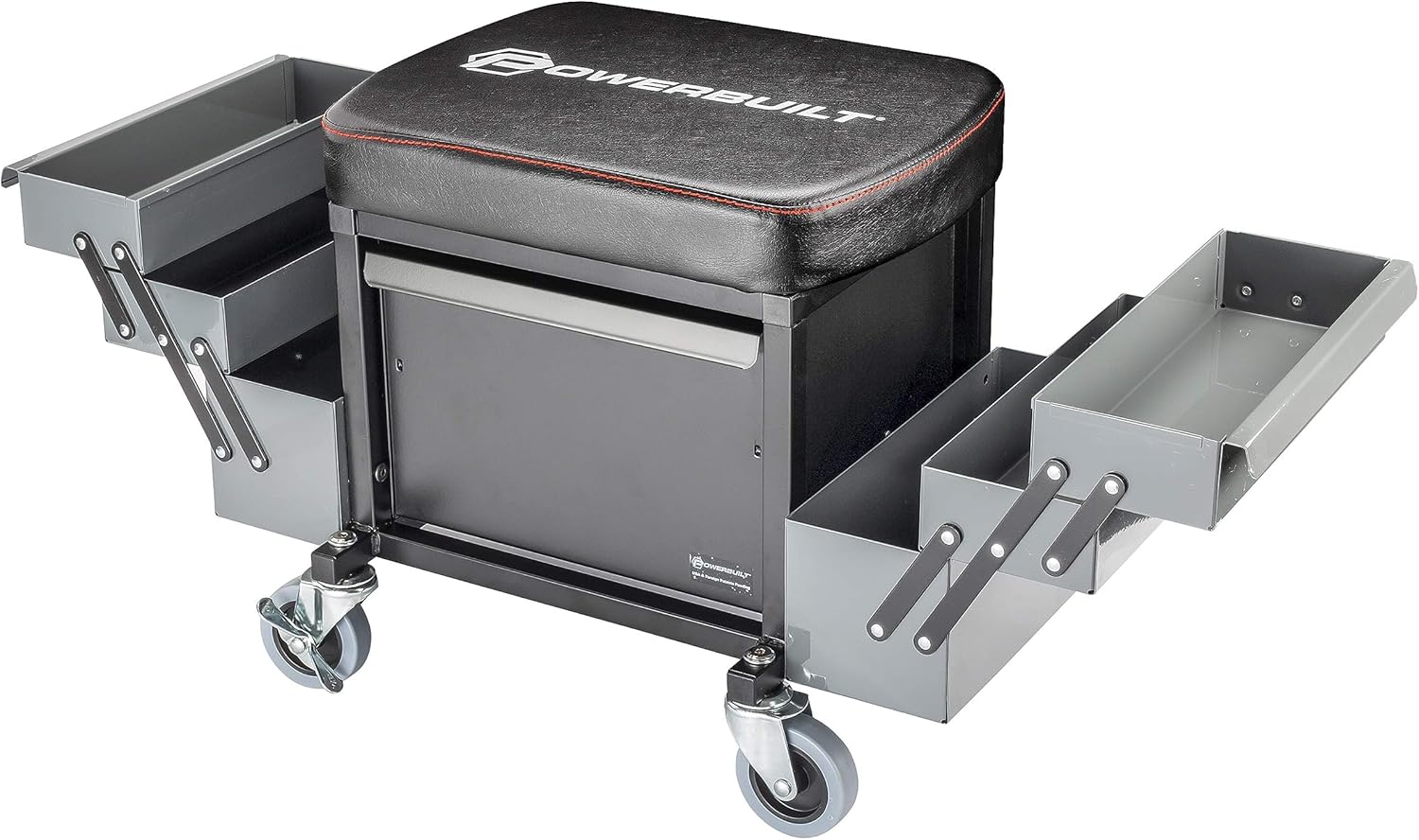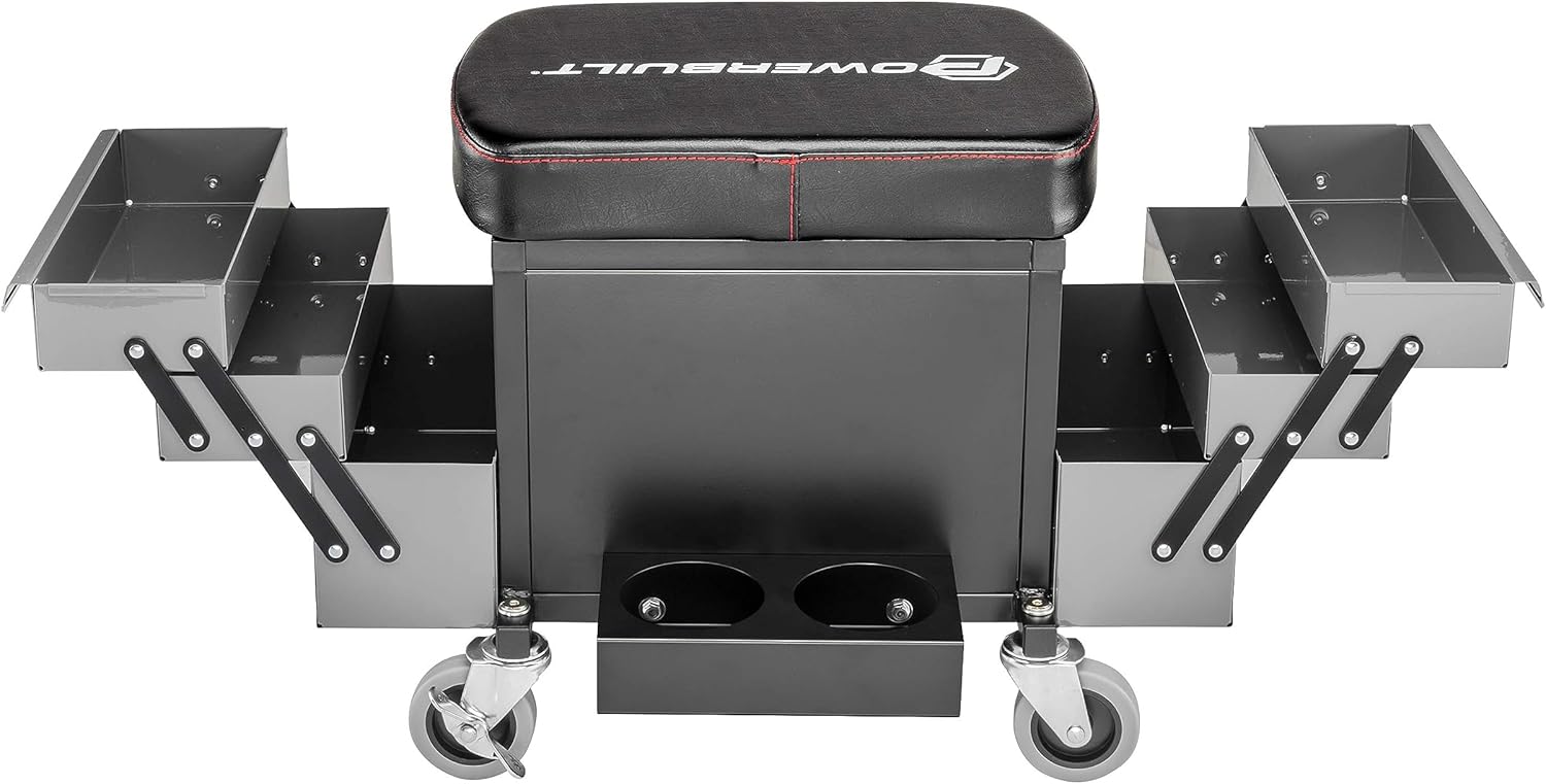 Powerbuilt Rolling Seat with Expandable Tool Trays, Roller Toolbox Garage Stool - Grey 941918ECE