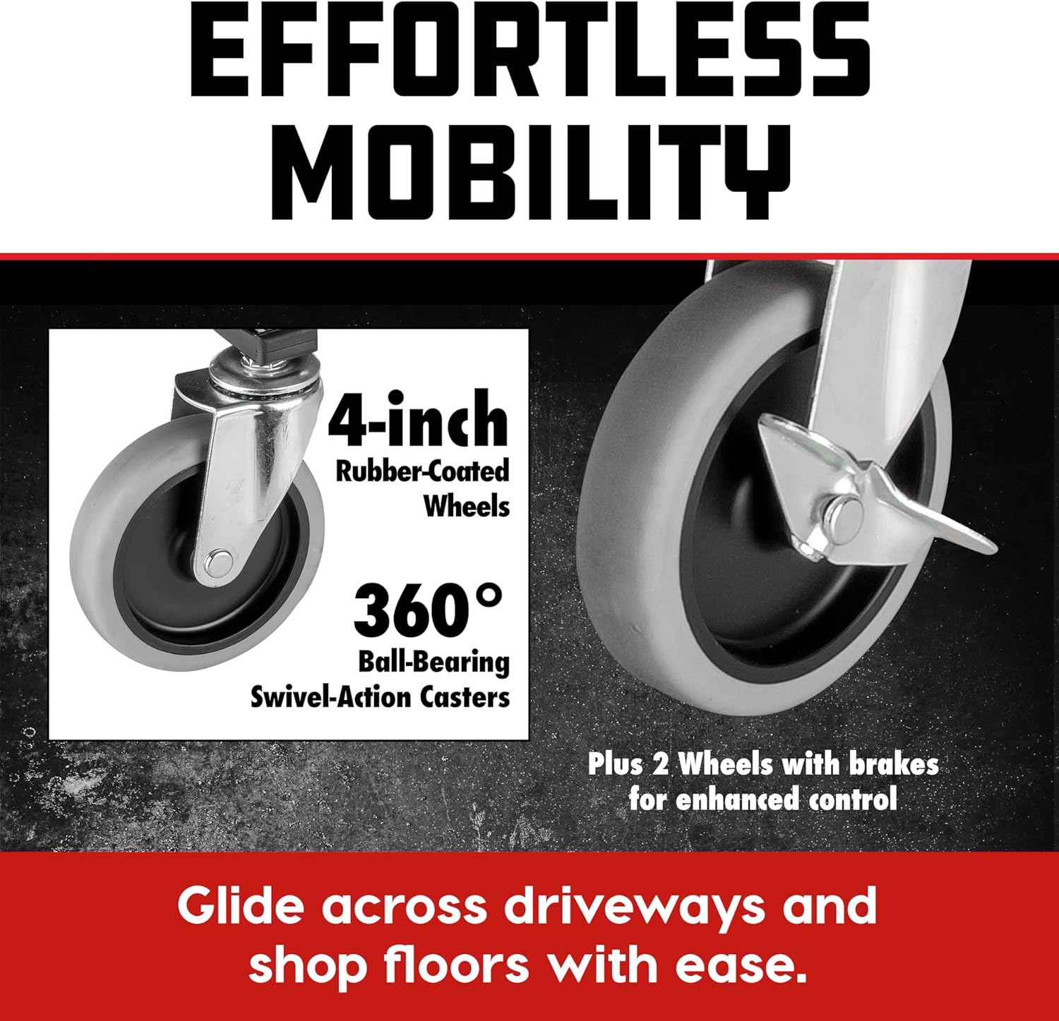 - EFFORTLESS MOBILITY: Glide across driveways and shop floors with unparalleled ease. The 4-inch rubber-coated wheels deliver a seamless rolling experience, while the ball-bearing swivel action on all four corners enables seamless direction changes. Additionally, two of the wheels come with brakes for enhanced control.