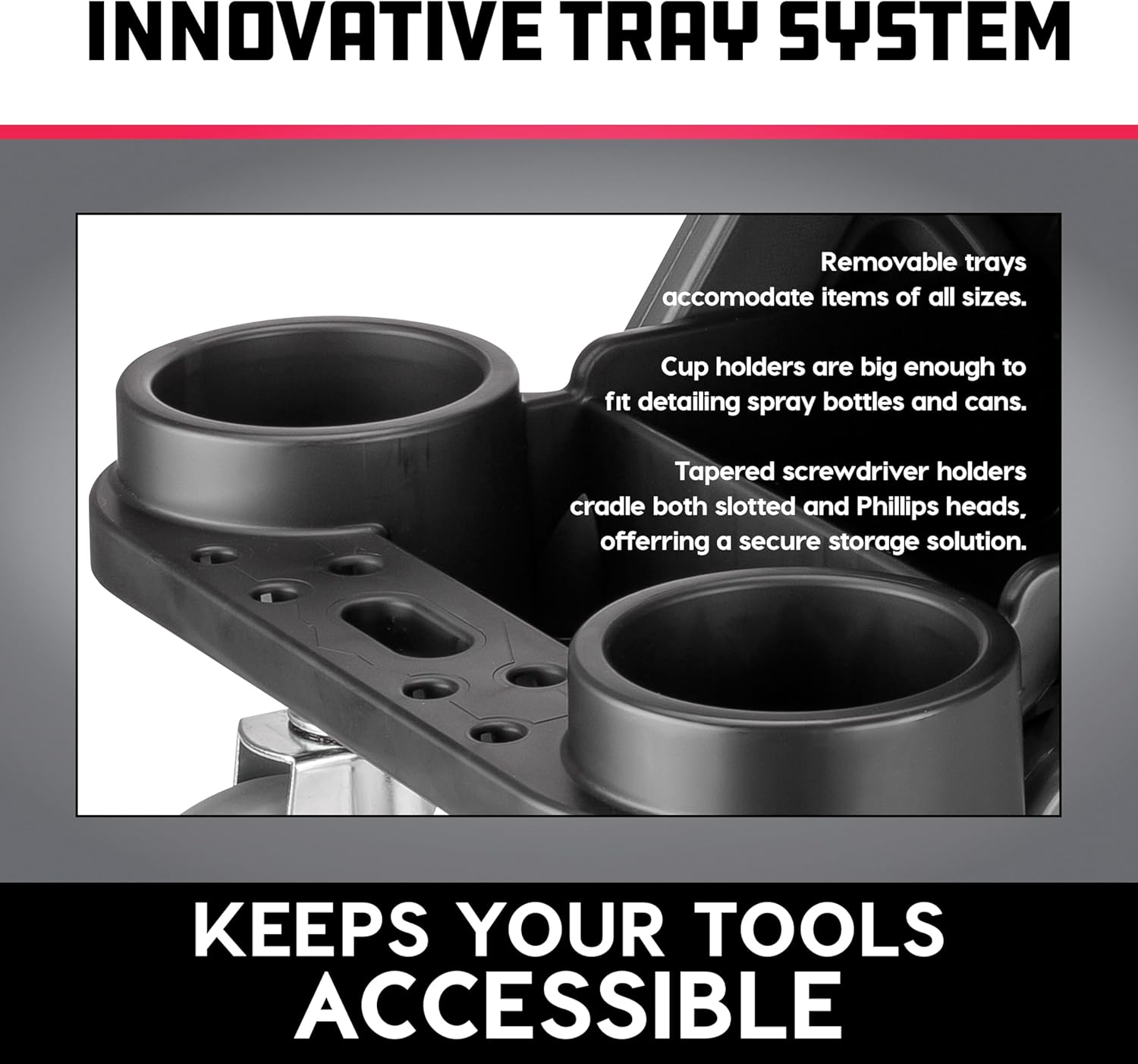 - TRAY SYSTEM: Innovative trays designed to accommodate items of all sizes. The tapered screwdriver holders cradle both slotted and Phillips heads, offering a secure storage solution that keeps your tools accessible.