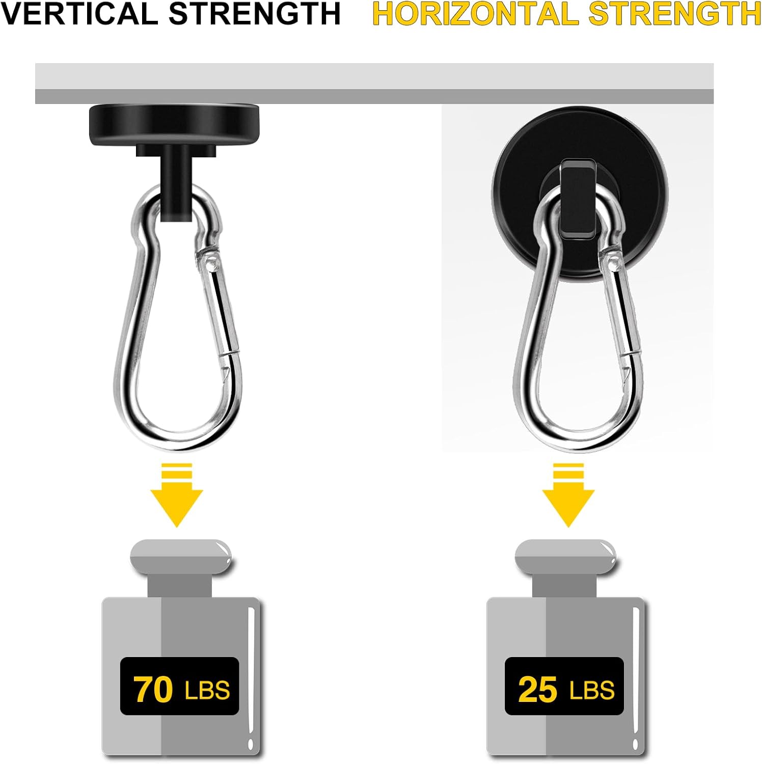 - POWERFUL MAGNET - The magnetic hooks are made of high-quality neodymium magnet, with strong magnetic force. It can reach 70lbs tension when suspended vertically and 20lbs tension when suspended horizontally