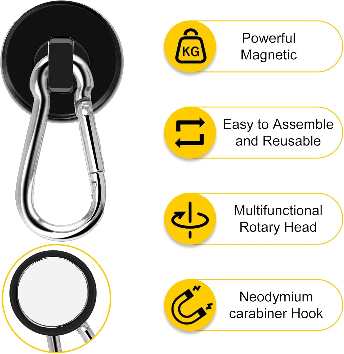 - SUPER DURABLE - These magnetic rotating hooks are plated with Ni+Cu+Ni triple protective layer, which is corrosion and rust resistant, and with the stainless steel carabiner, our hooks are great for outdoor long time use.