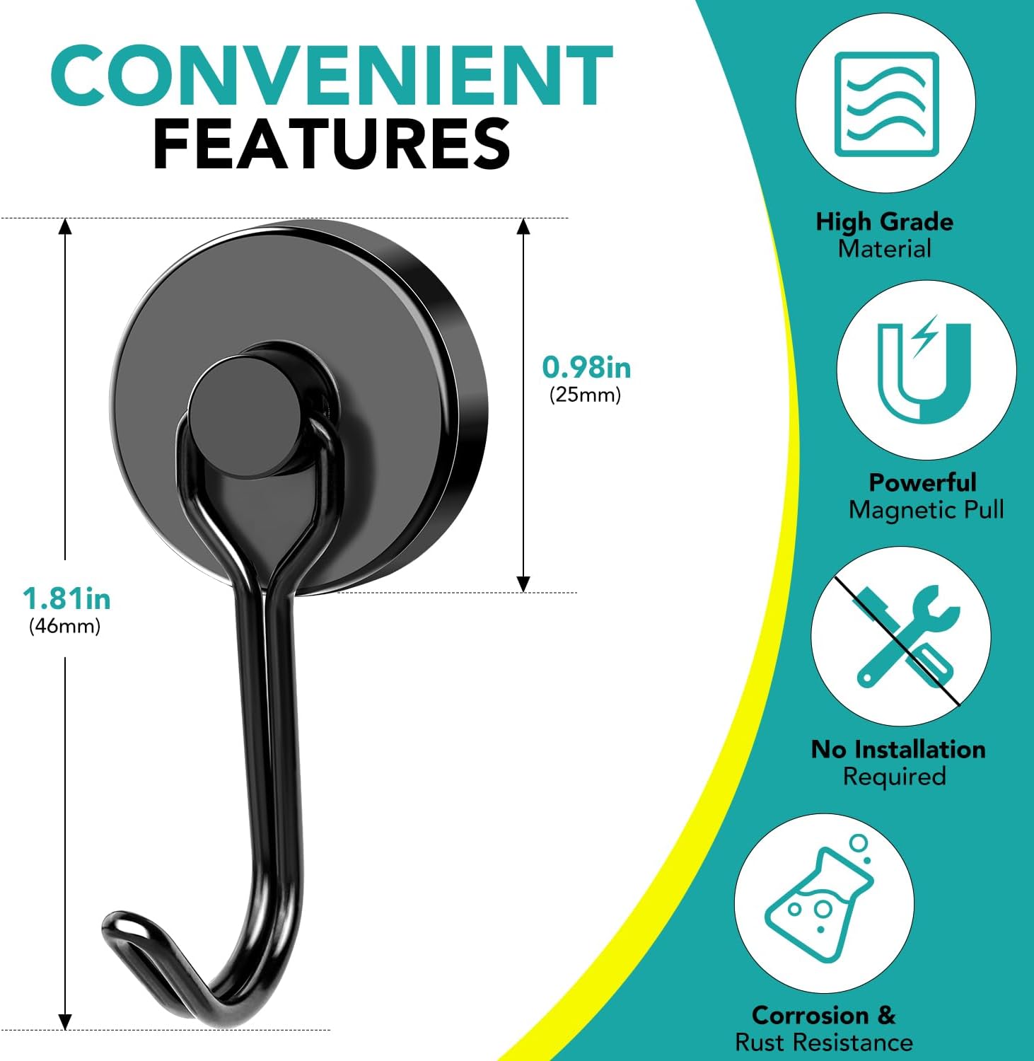 - 【Swivel Magnetic Hooks Set】The package contains 4Pcs black magnetic hooks, each diameter is 0.98inch/25mm, Magnetic hooks 80LBS Capacity is based on horizontal application,and reduced by 2/3 if used vertically