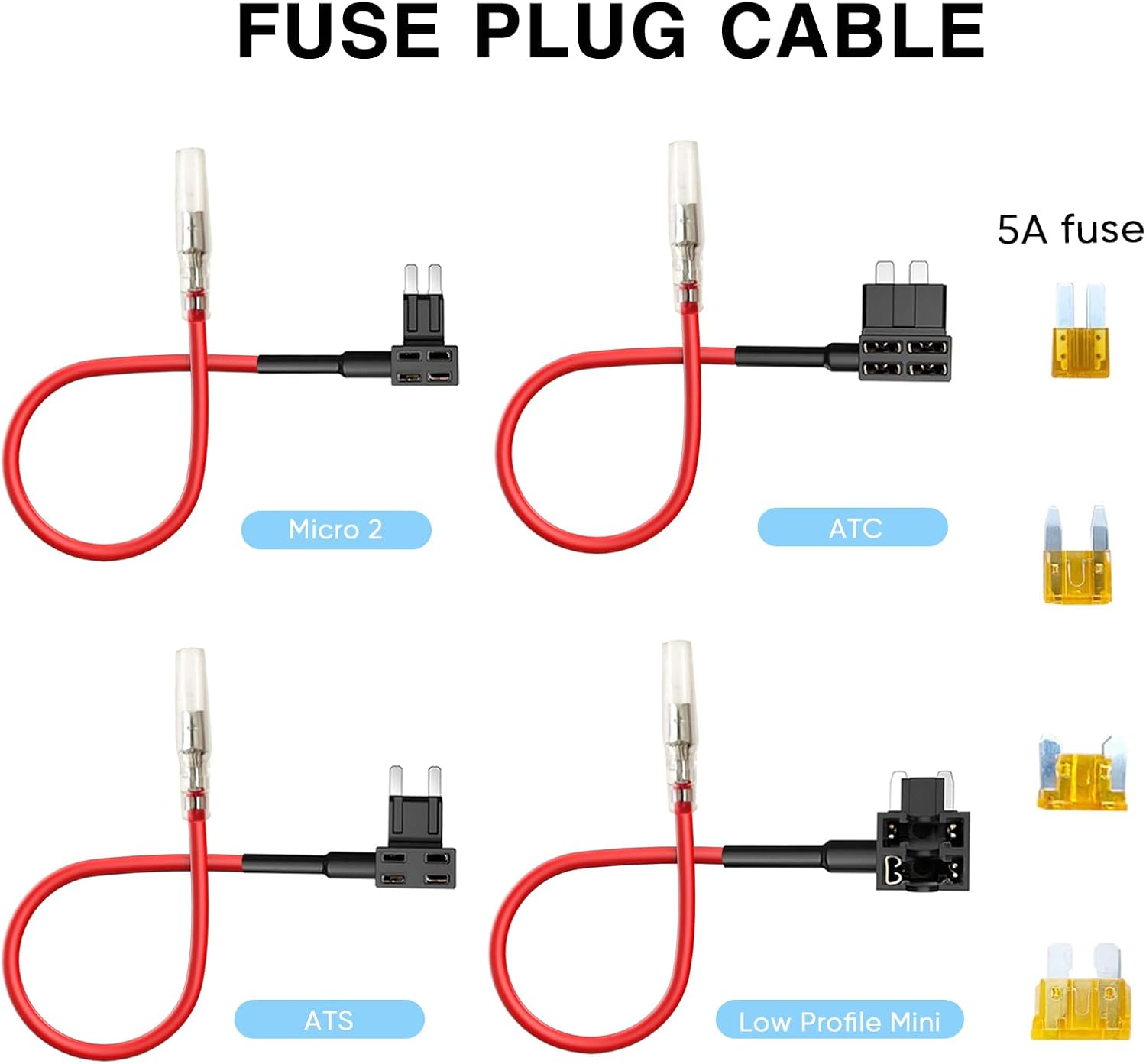 - Radar detector cable kit is equipped with various fuse sizes, including four common sizes: ATC,ATS,Micro 2,and Mini,Each fuse tap is equipped with a 5a fuse.Please read the user manual carefully before use