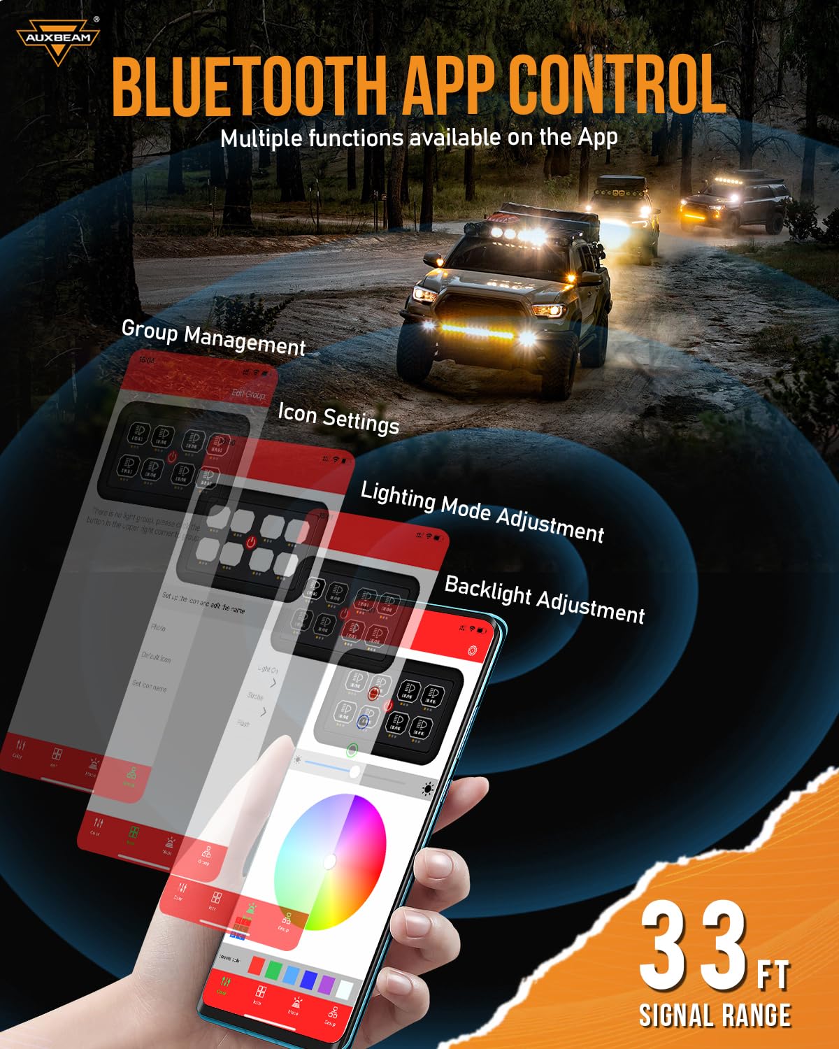 - RGB Backlight with Auto-Dimming: The Auxbeam 8 gang switch panel automatically adjusts the backlight brightness based on the ambient light, ensuring comfort in any lighting condition. Moreover, the RGB backlight design allows you to personalize your driving experience with a wide range of colors.
