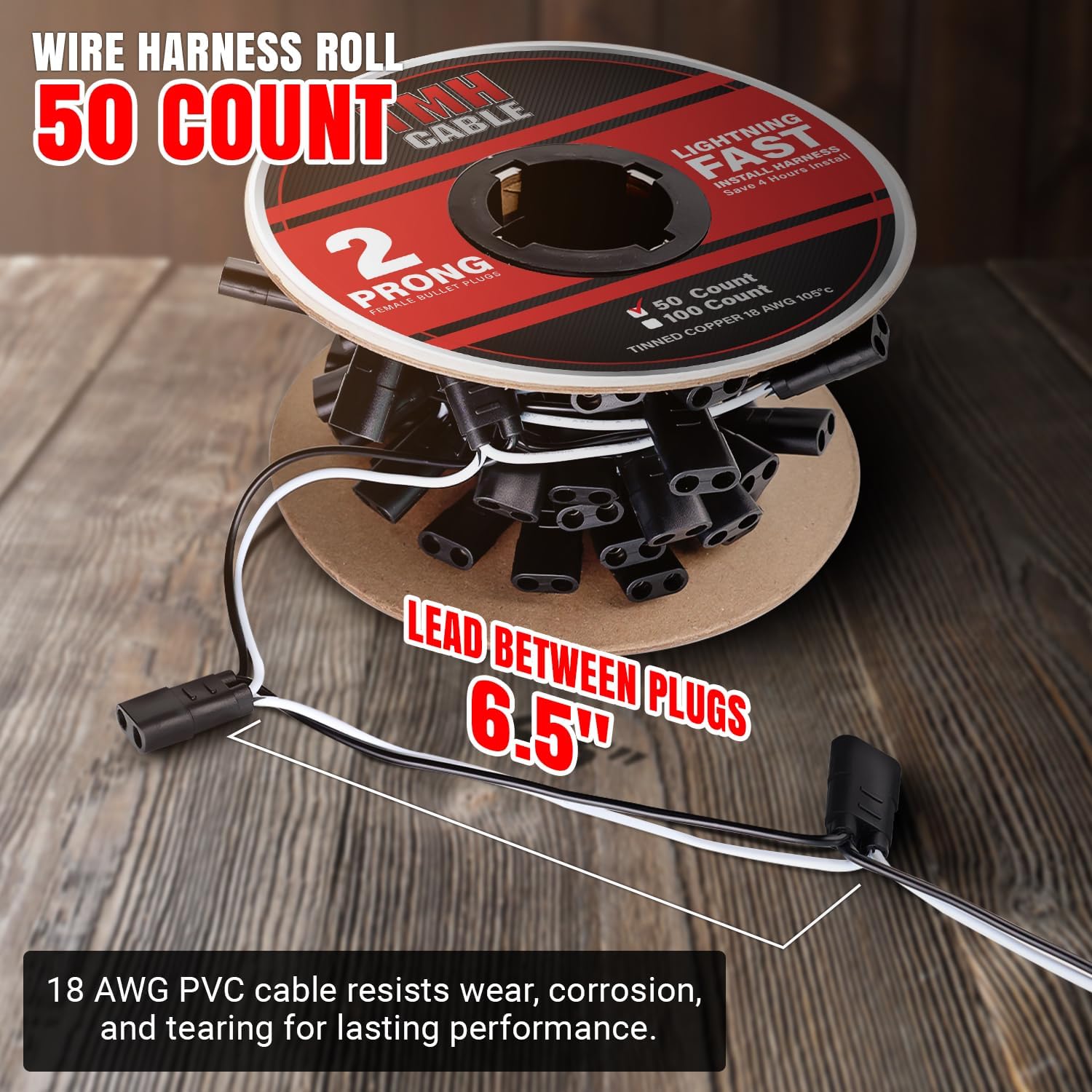 TMH 50 Count 2-Prong Wire Harness Roll Double Female Bullet Plug 18 Gauge - 6.5" Spacing for LED Marker Clearance Lights Hassle-Free Installation