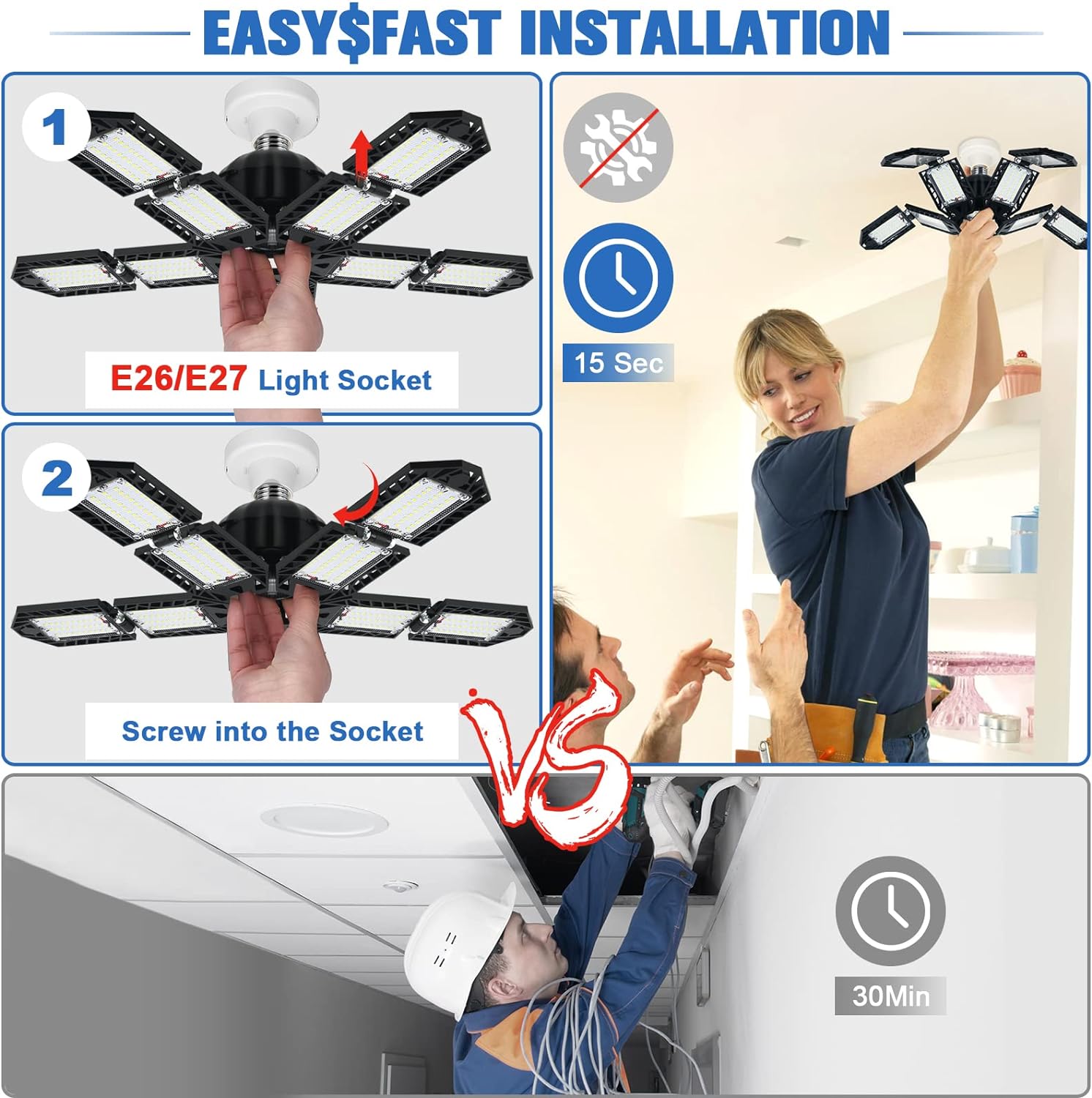 - 【Easy Installation】 Our shop lighting, garage lighting can supper fit for the E26/E27 socket, it is as simple as installing it in a ordinary a light bulb. You only needs 30 seconds for done. no need of any tools, wiring, or professional electrician. They are good led lights for shop.
