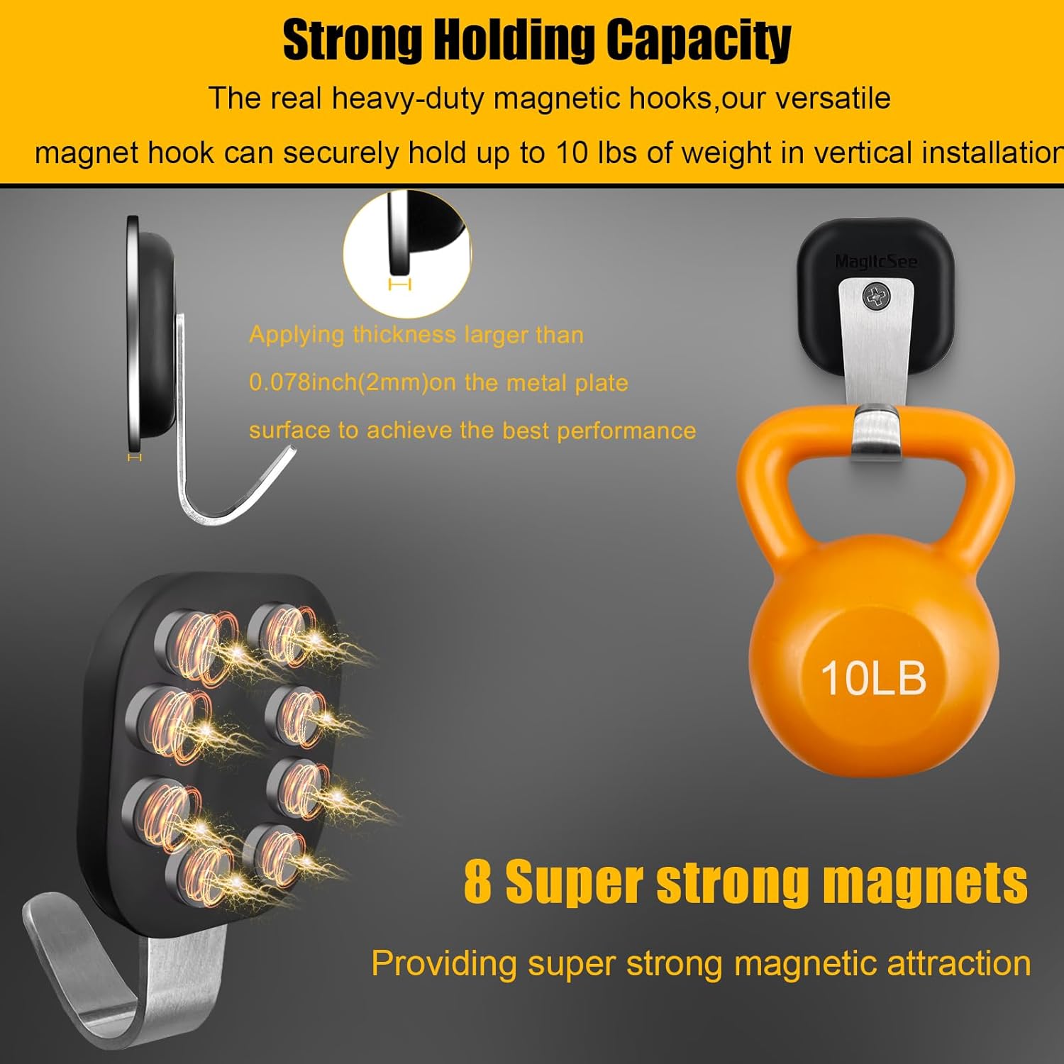 - Strong Holding Capacity: Design includes 8 magnets can securely hold up to 10 lbs of weight in vertical installation, providing a reliable and convenient hanging solution for various items in your home, office, RV,cruise workshop, or other spaces