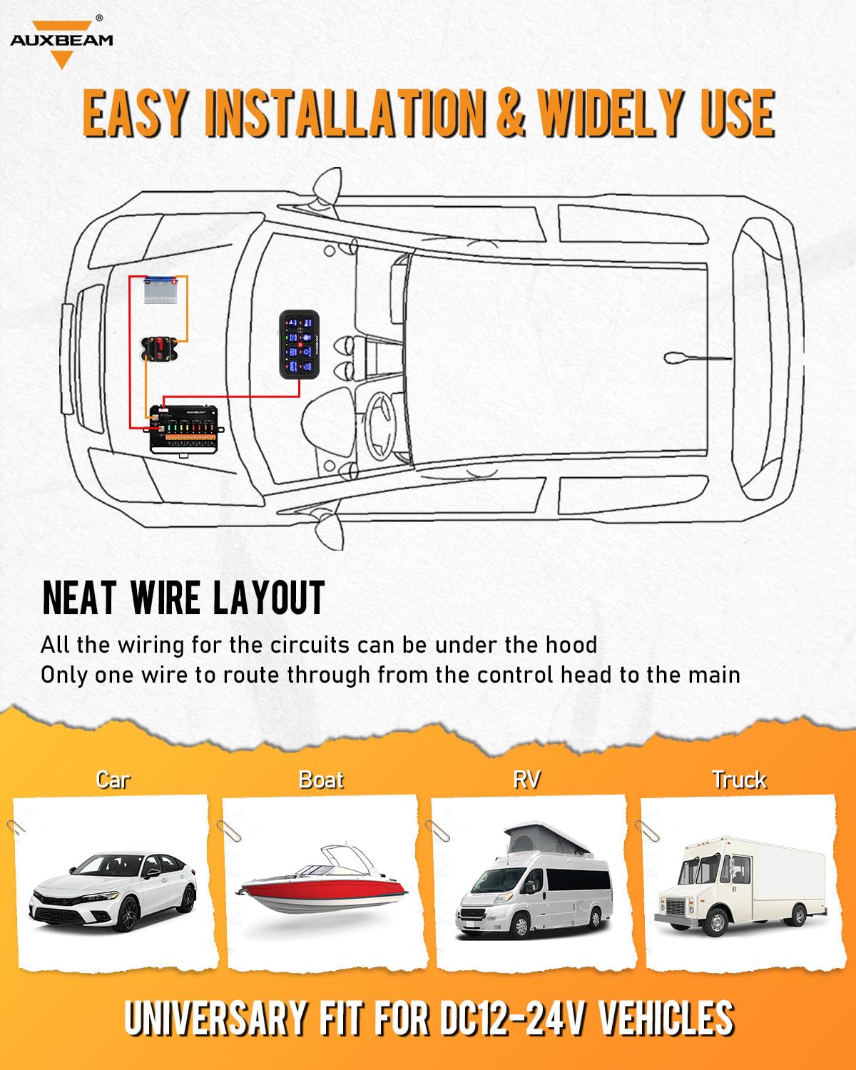 - Compatible with 12V/24V Systems : The wireless switch panel is popular in RVs, trucks, sports cars, boats, UTVs, and ATVs. The upgraded remote control makes it easier for you to control the devices! Need assistance? Auxbeam Team guarantees a 2-year warranty & 24-hour friendly online service.
