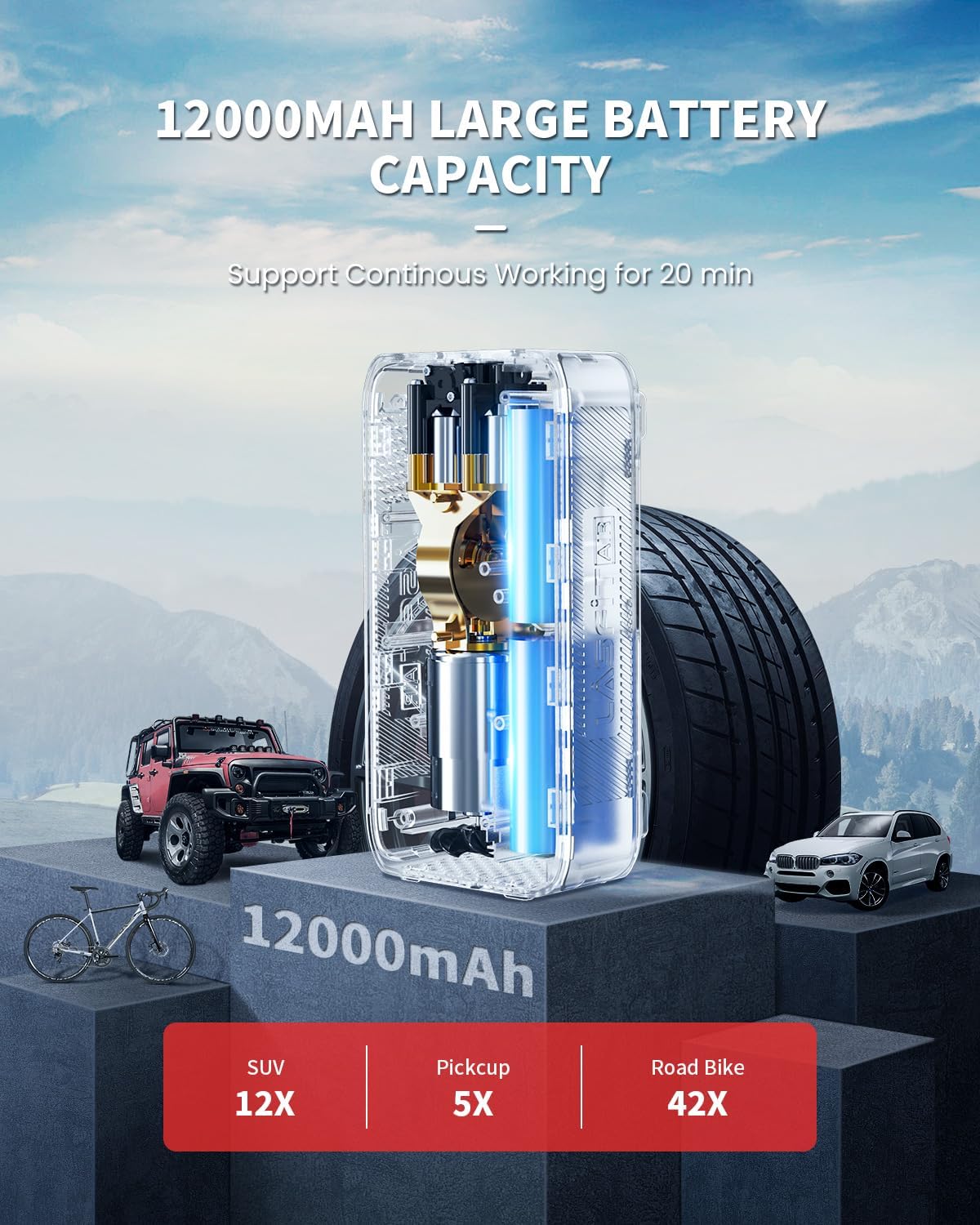LASFIT TK1 Tire Inflator Portable Air Compressor [Fit Pickup Truck & Large SUVs] 150PSI Tire Inflator 12000mAH Battery Operated Air Pump for Car Tires with Digital Pressure Gauge, Smart Auto Stop