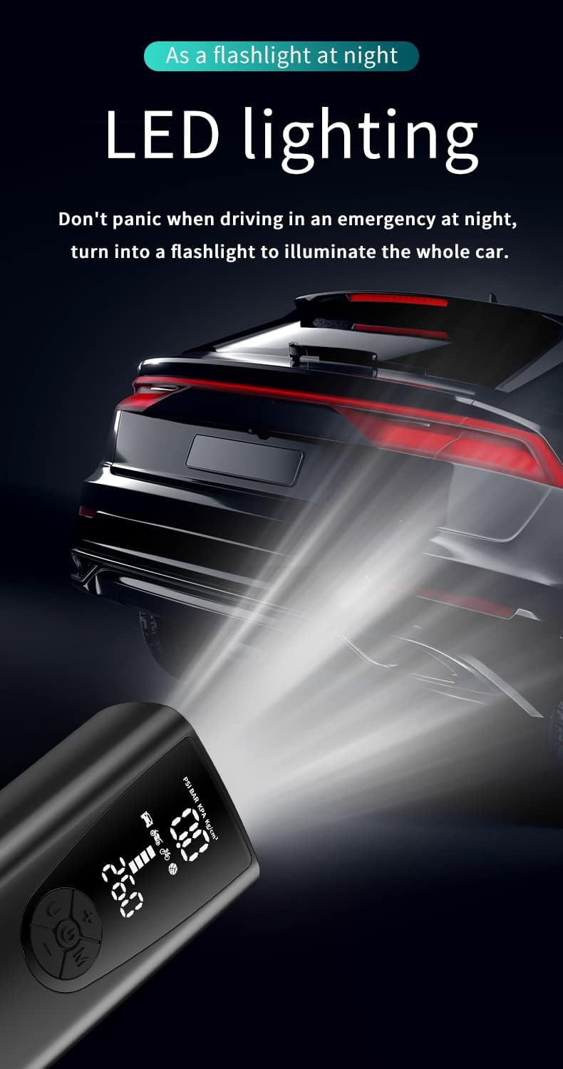 - LED Large Digital Display -- The emergency tire inflator is equipped with a precise and bright digital display (±1% psi, international precision standard), and the unit can be changed which you need. One-click to change pressure units among PSI, BAR and Kg/cm2