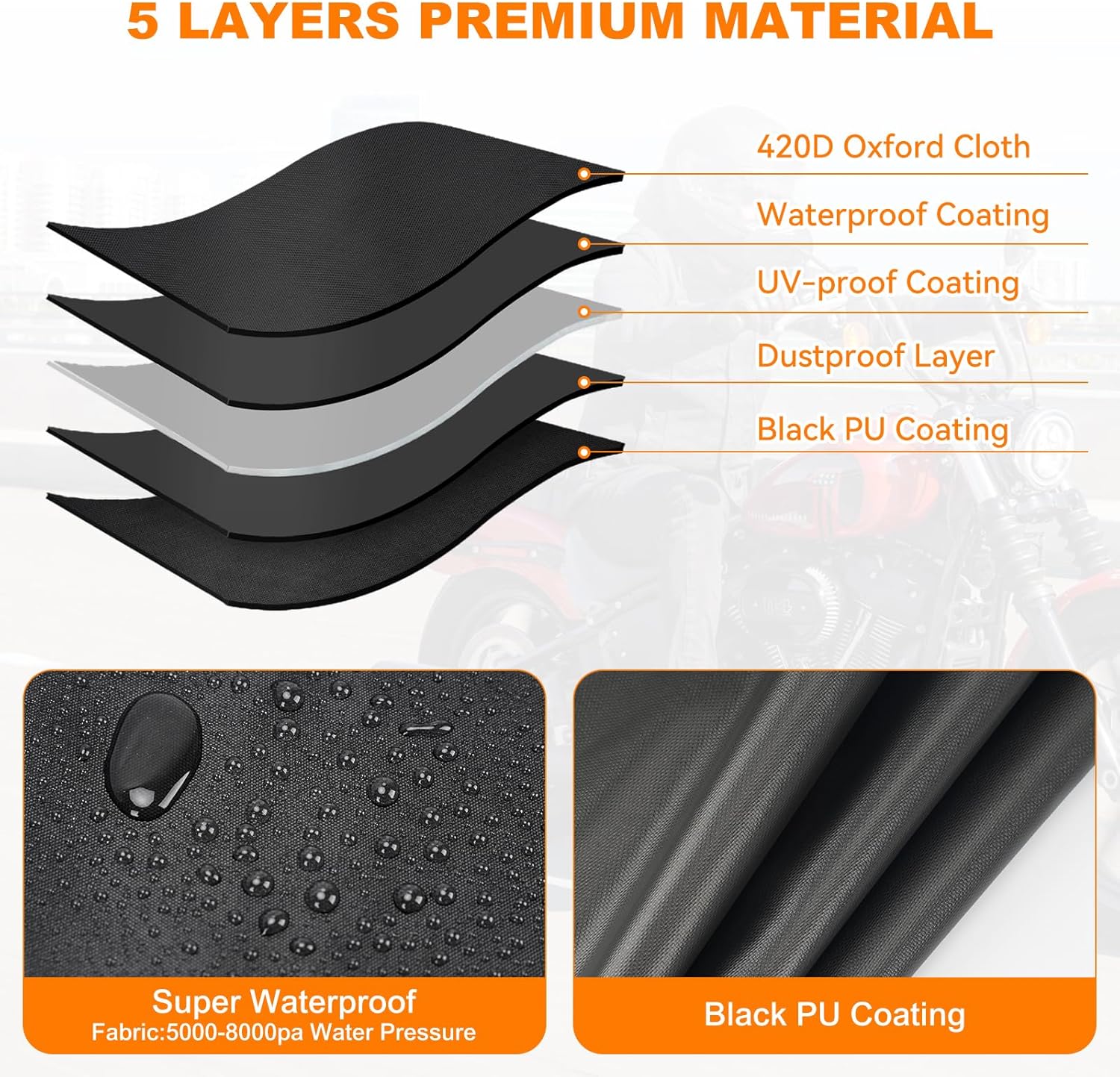 - 【WHAT IS THE MATERIALS】The motorcycle covers are made from greater 420D Oxford Fabric. which are printed with PU coating. In other words, compared with others, we provide higher density textiles and better elasticity, so the cover are durable enough and fairly thick.There is also a significant increase in water resistance, with a maximum of up to 8,000 Pa of water pressure.