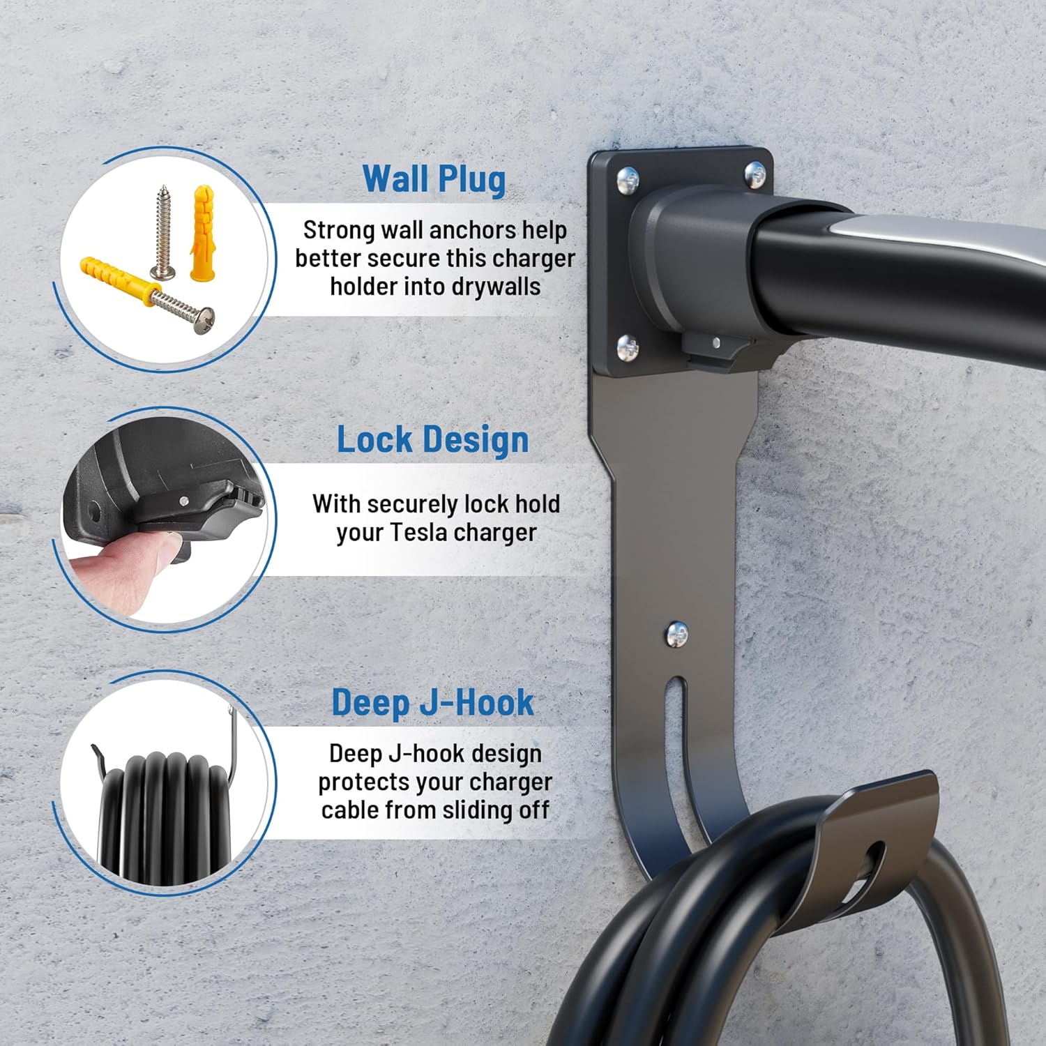 - Improve Organization: - Wall-mount cable organizer for Tesla Model S/X/3/Y keeps your charging cable neatly and secure. Tesla home charger cord holder features a built-in locking mechanism could securely holds your tesla charger plug firmly prevents it from falling out