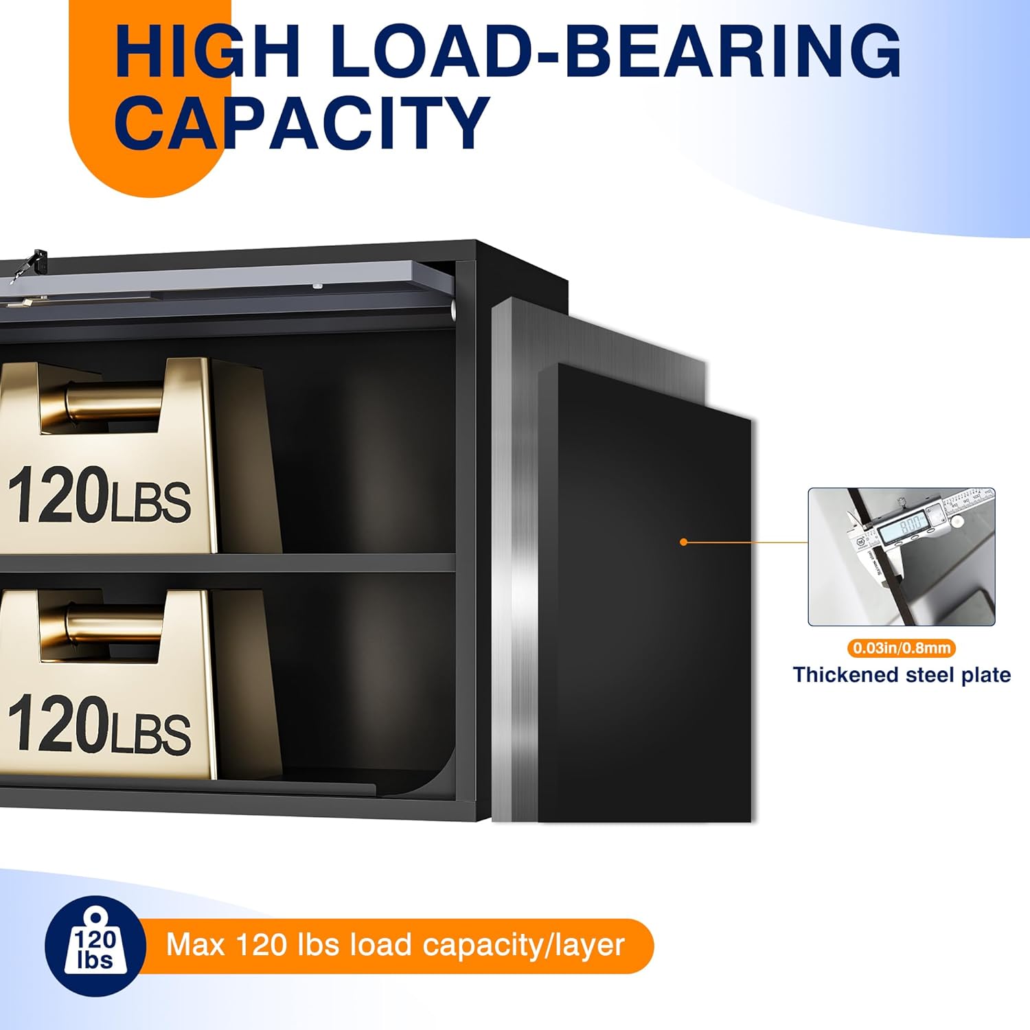 - 『PREMIUM QUALITY MATERIAL』 Heavy Duty Garage Storage Cabinets are made from 0.8mm high pressure steel plate that can withstand loads of up to 120lbs; the powder coating gives the cabinets a textured look and is rust and scratch resistant to complement a variety of decor styles.