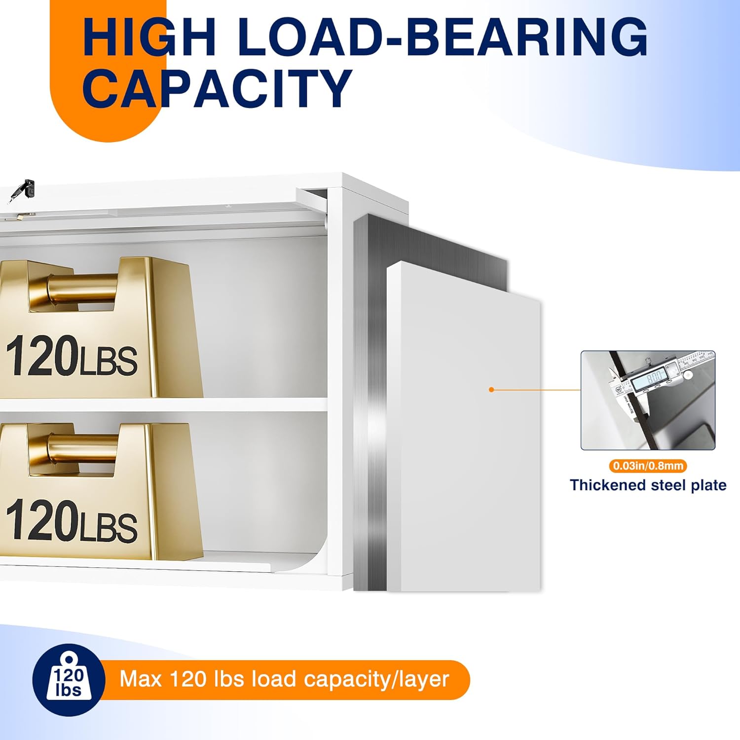 - 『PREMIUM QUALITY MATERIAL』 Heavy Duty Garage Storage Cabinets are made from 0.8mm high pressure steel plate that can withstand loads of up to 120lbs; the powder coating gives the cabinets a textured look and is rust and scratch resistant to complement a variety of decor styles.