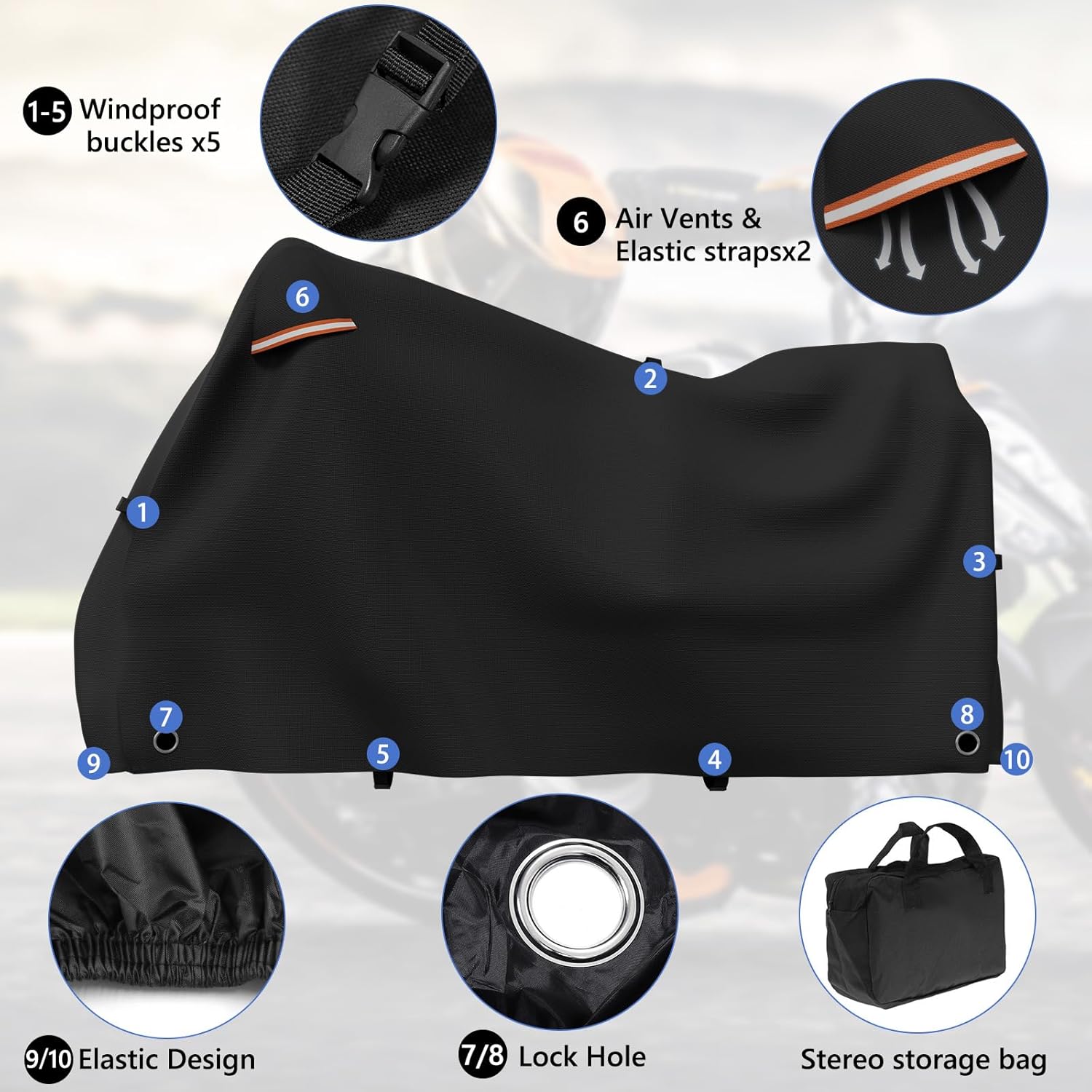- 【Windproof and Waterproof】(1) Three windproof buckles under the cover are to make sure the cover stay in the place. (2) Front and rear Elastic hems on the bottom to keep the cover from being lifted by wind and for a snug and secure fit. In addition, One buckle on the cover is to adjust the tightness of the cover. (3) Double-stitched & Waterproof Strip make the motorcycle cover better waterproof, no water seepage.