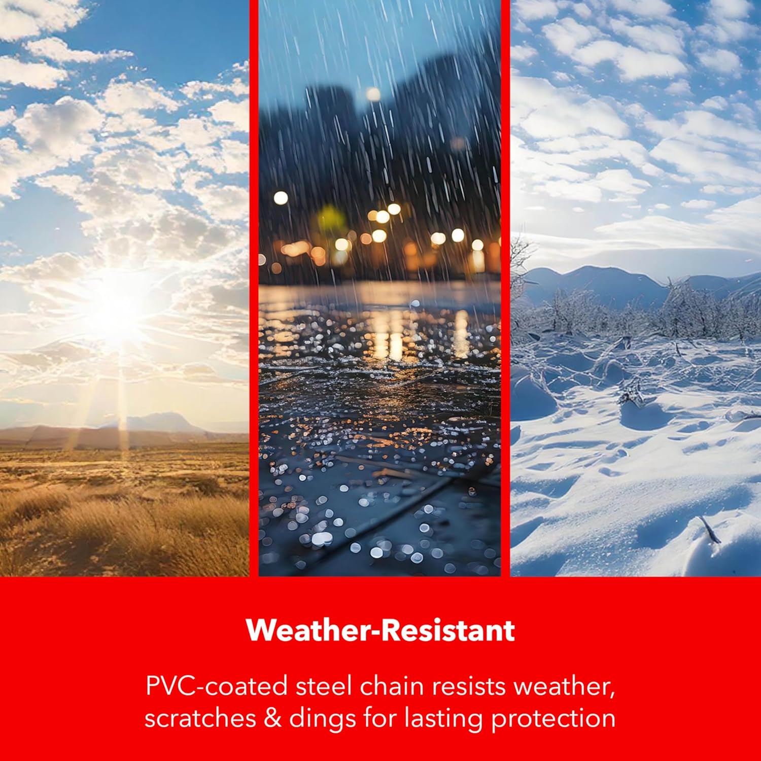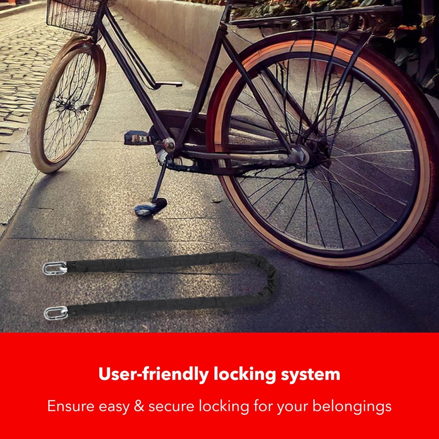 - Weatherproof PVC Coating – The durable PVC sleeve protects the chain from rust, corrosion, and extreme weather conditions, while also preventing scratches on your bike or other secured items