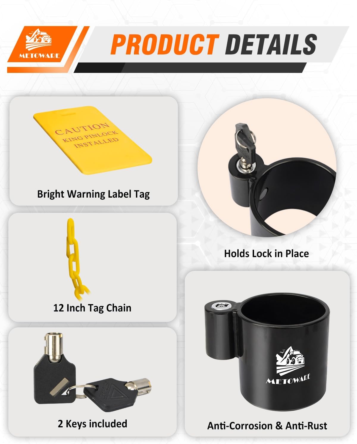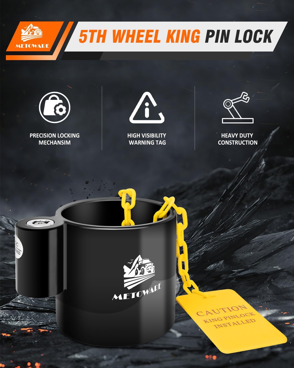 - EYE-CATCHING WARNING LABELS:This 5th wheel King Pin lock comes with a 12-inch chain and bright red warning label tag attachment that will remind you to remove it before hitching. Each warning label has a warning message in English to keep you safe.
