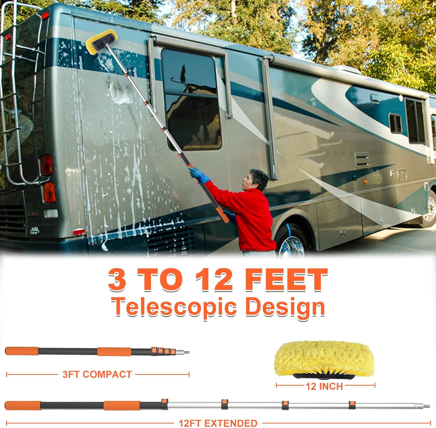 Buyplus 12FT Car Wash Brush with Long Handle, 12-Inch Soft Bristle, with Aluminium Telescoping Pole, for Cleaning Car, SUV, RV, Boats, House Siding, Floors, Solar Panels, and More