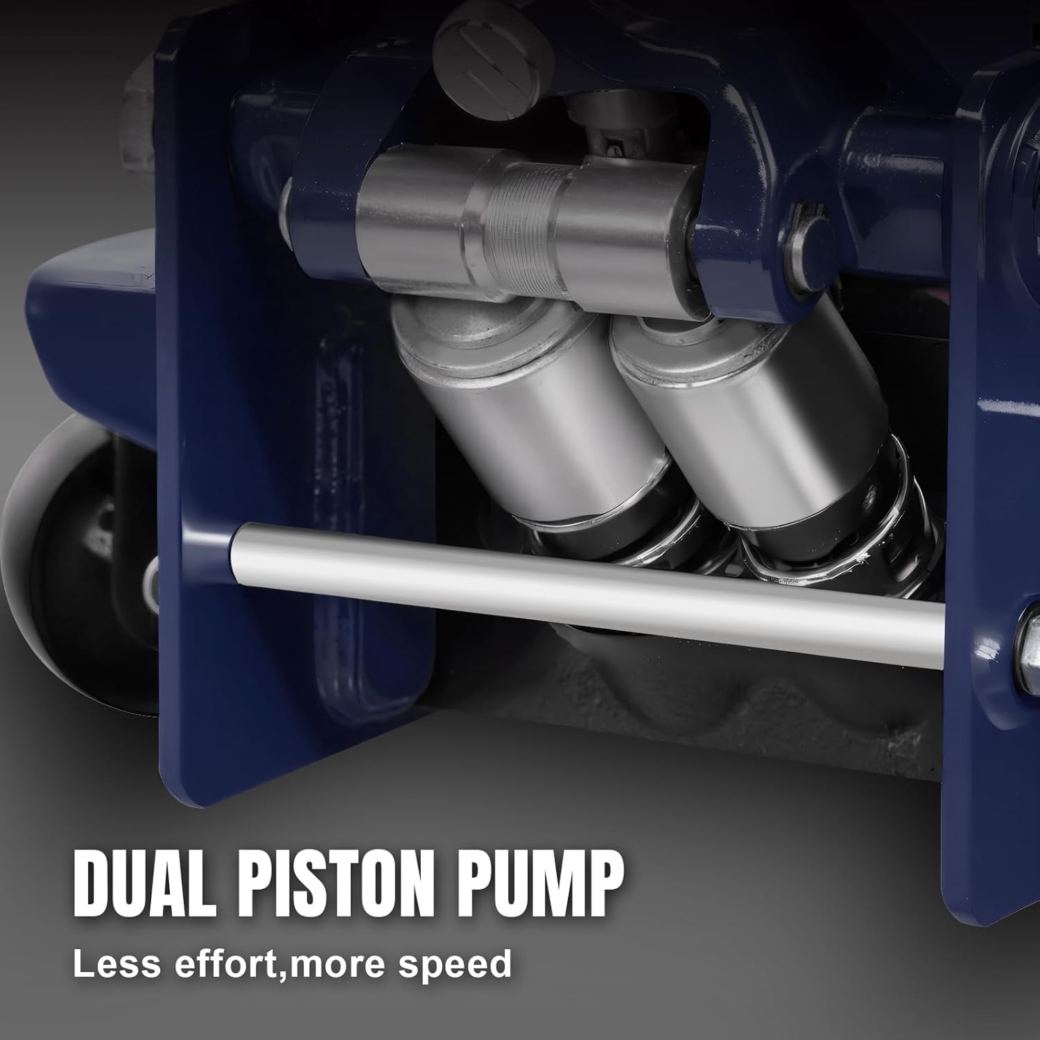 - Quick Lift & User-Friendly Design:Dual-piston pump technology reduces lifting effort by 50%, reaching max height in just 7 strokes. Includes a foam-bumper handle for added vehicle protection and a magnetic tray for tool organization.