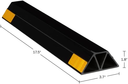 - PRODUCT DETAILS - Materials: Molded Hardened Plastic. Dimensions: (L) 17.5 x (W) 3.7 x (H) 1.8; Weight: 3.75lbs. Set of 2 Wheel Stops for Garage. Color: Black with Yellow Visibility Stripes.