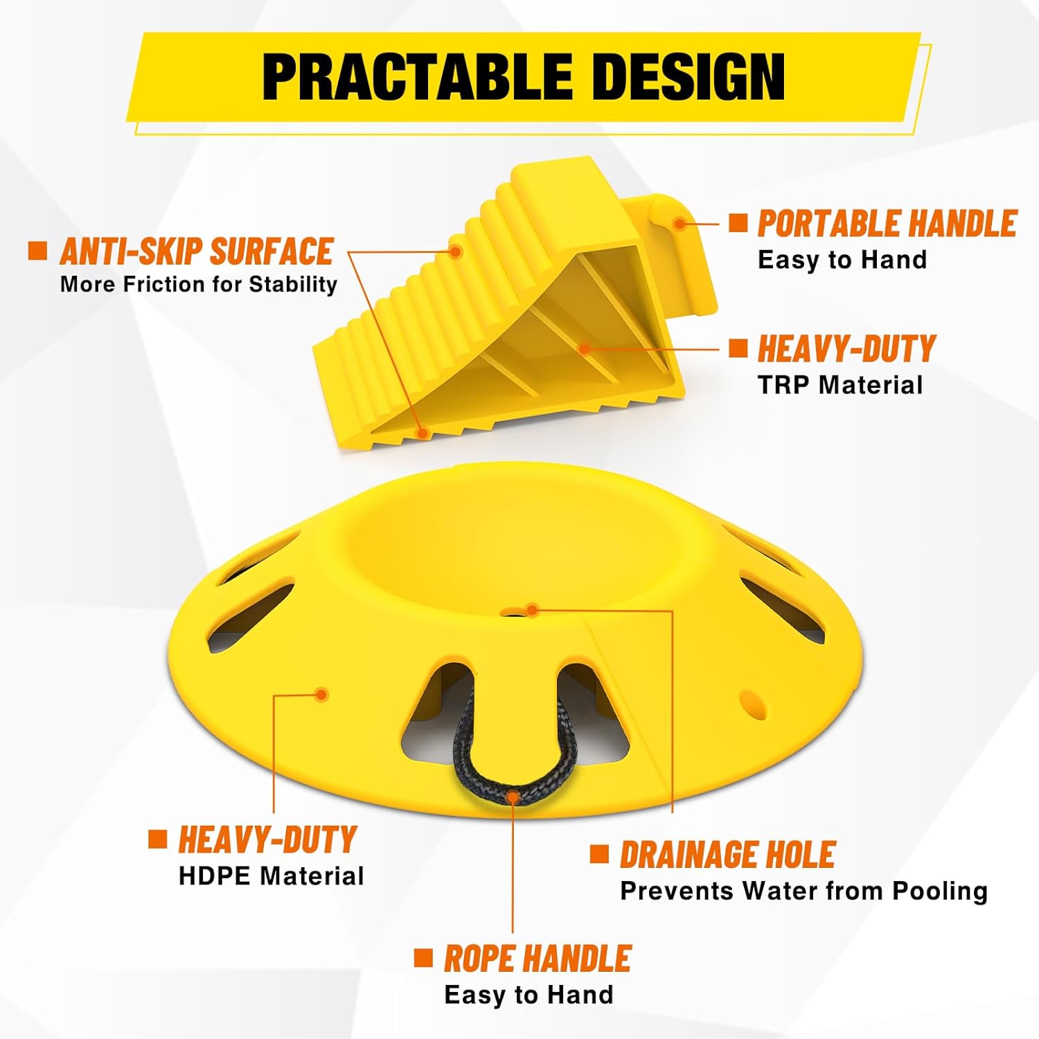 - Practical Design: The wheel dock features a rope handle and water drain, while the wheel chock with anti-slip surface and portable grab handle. Designed for all weather conditions and easy to use and storage