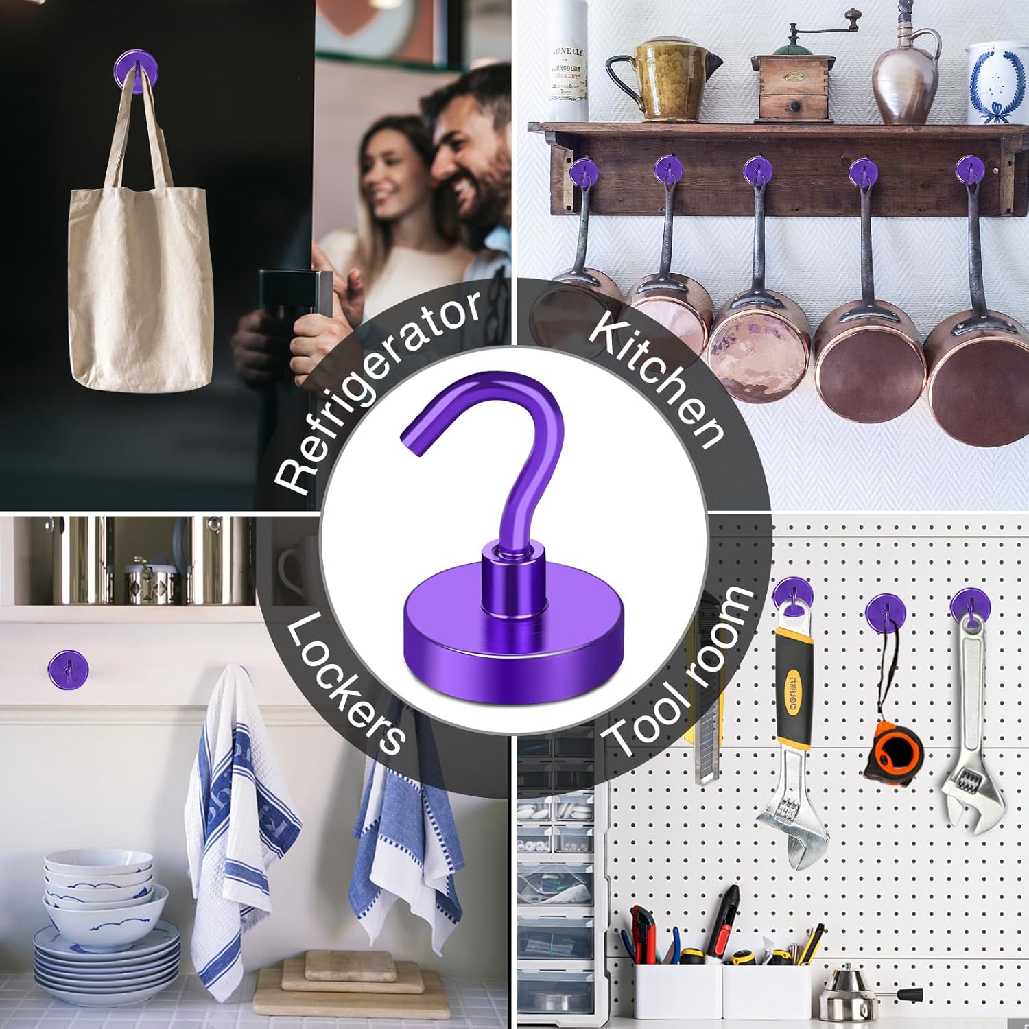 MIKEDE Magnetic Hooks,80LB Heavy Duty Magnets with Hook for Fridge, Super Strong Magnets Neodymium Extra Strength Industrial Hooks for Hanging, Toolbox, Cruise(Purple, 4 Pack)