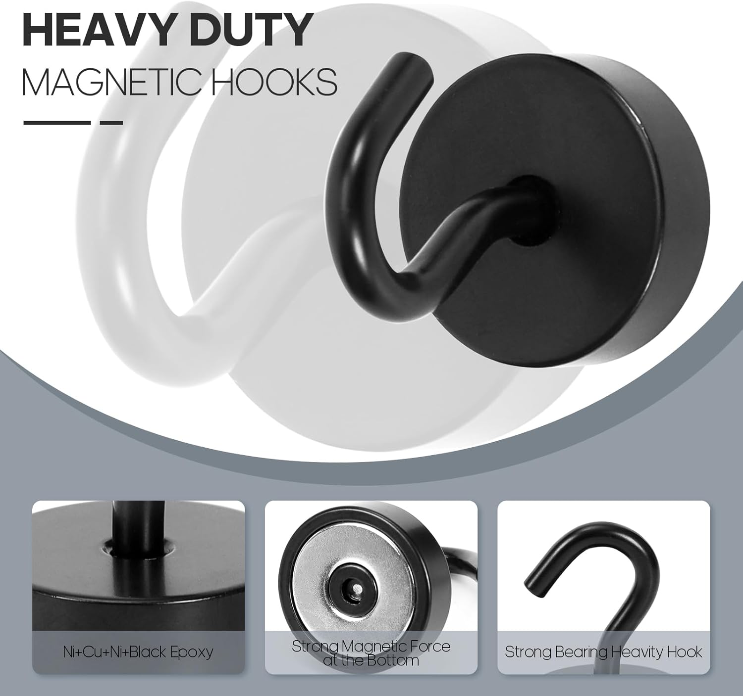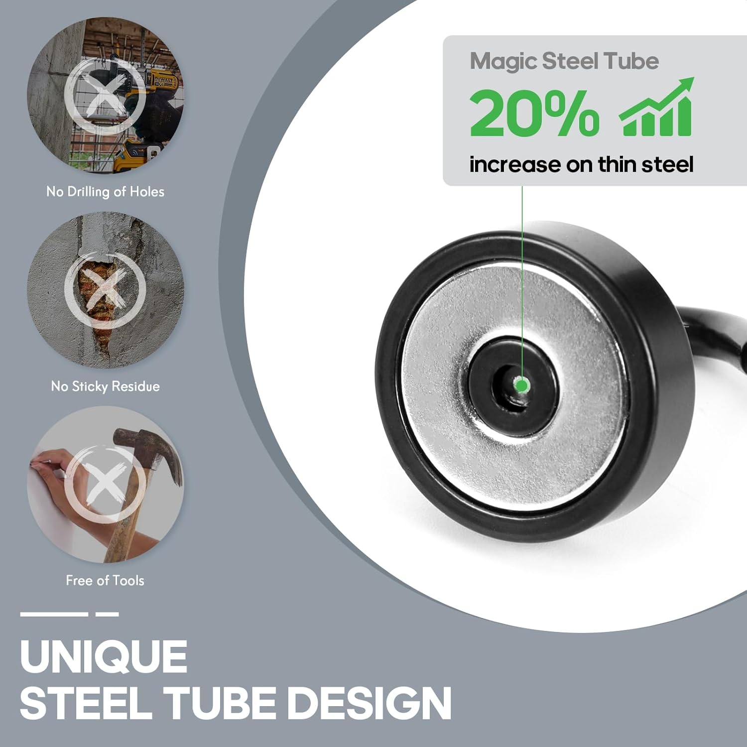 - ✔MAGIC STEEL TUBE DESIGN - Unique design of steel tube inside the base of magnetic hooks greatly increases the attractive force , especially on thin steel! It increase approximately 20% force comparing those none-tube magnets. it solves the problem of weak force on thin steel. Permanent magnetic hook with magic steel tube, strong magnetism lasts forever!