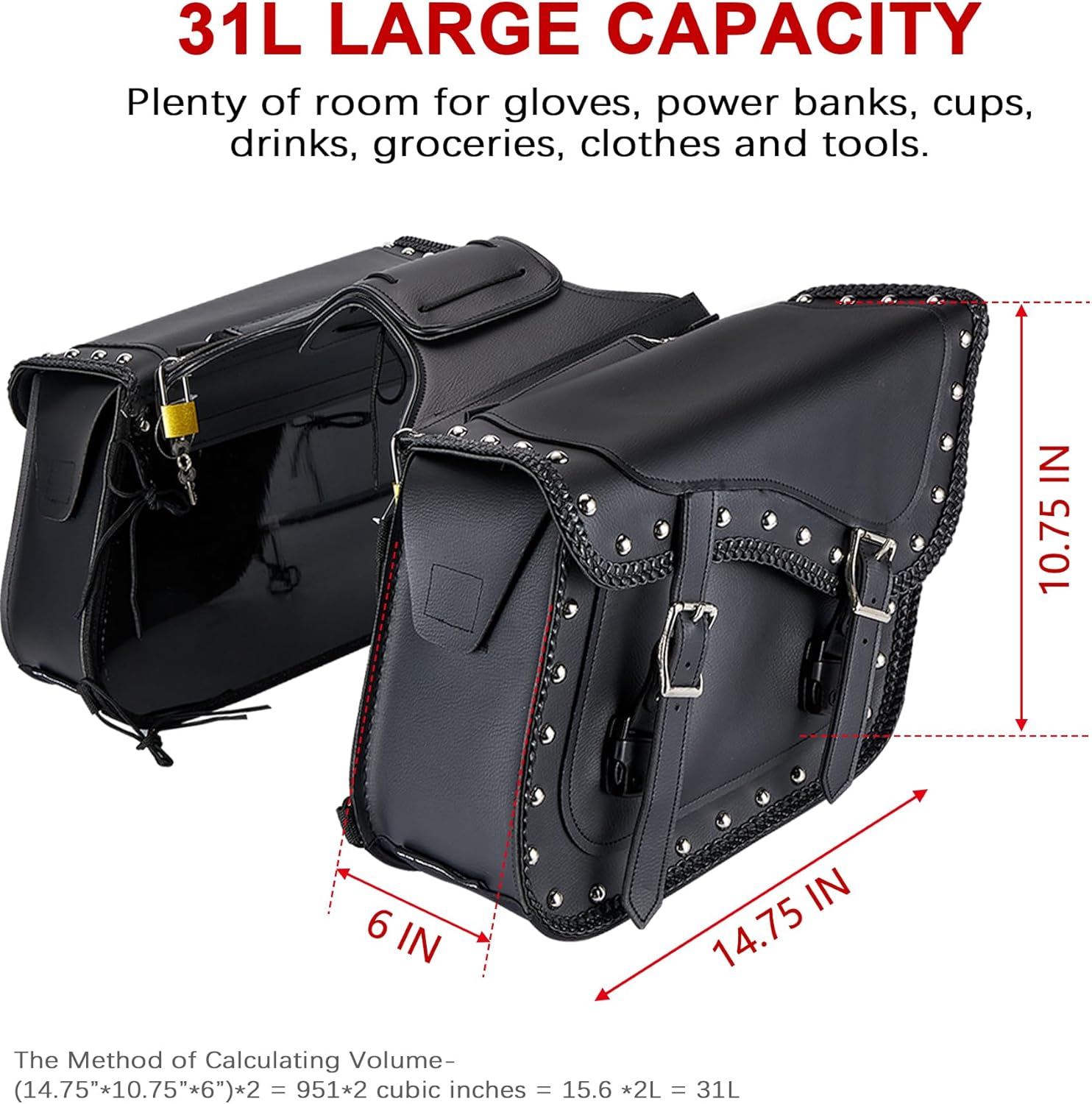 - [31L Large Capacity] - The package comes with a pair of saddle bags. One of throw over saddlebags measures 14.75"W x 6"D x 10.75"H. There is enough storage space for what you need, such as gloves, wallets, smart phones, earphone, keys, power banks, cups, drinks, raincoat, clothes, tools or other daily necessities. The saddlebags with a total of 31L large capacity are perfect for commuting and short vacations.