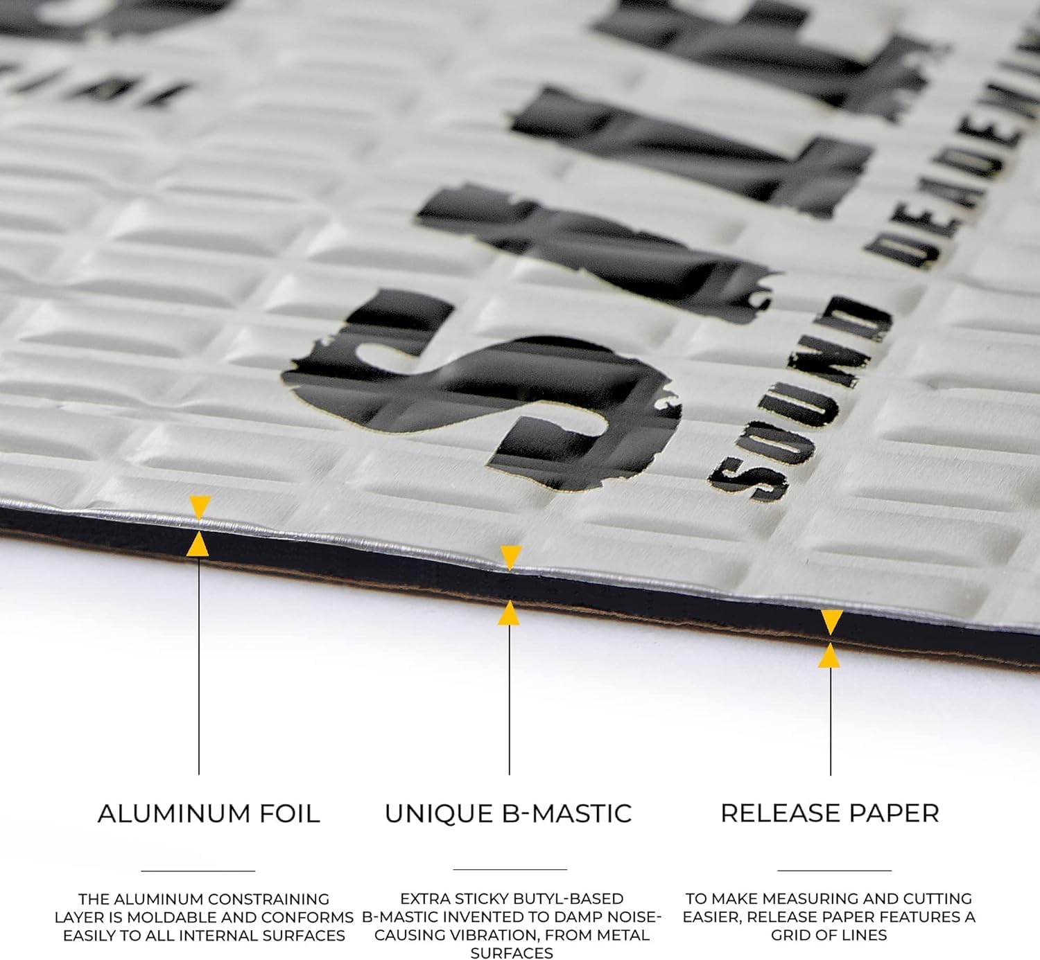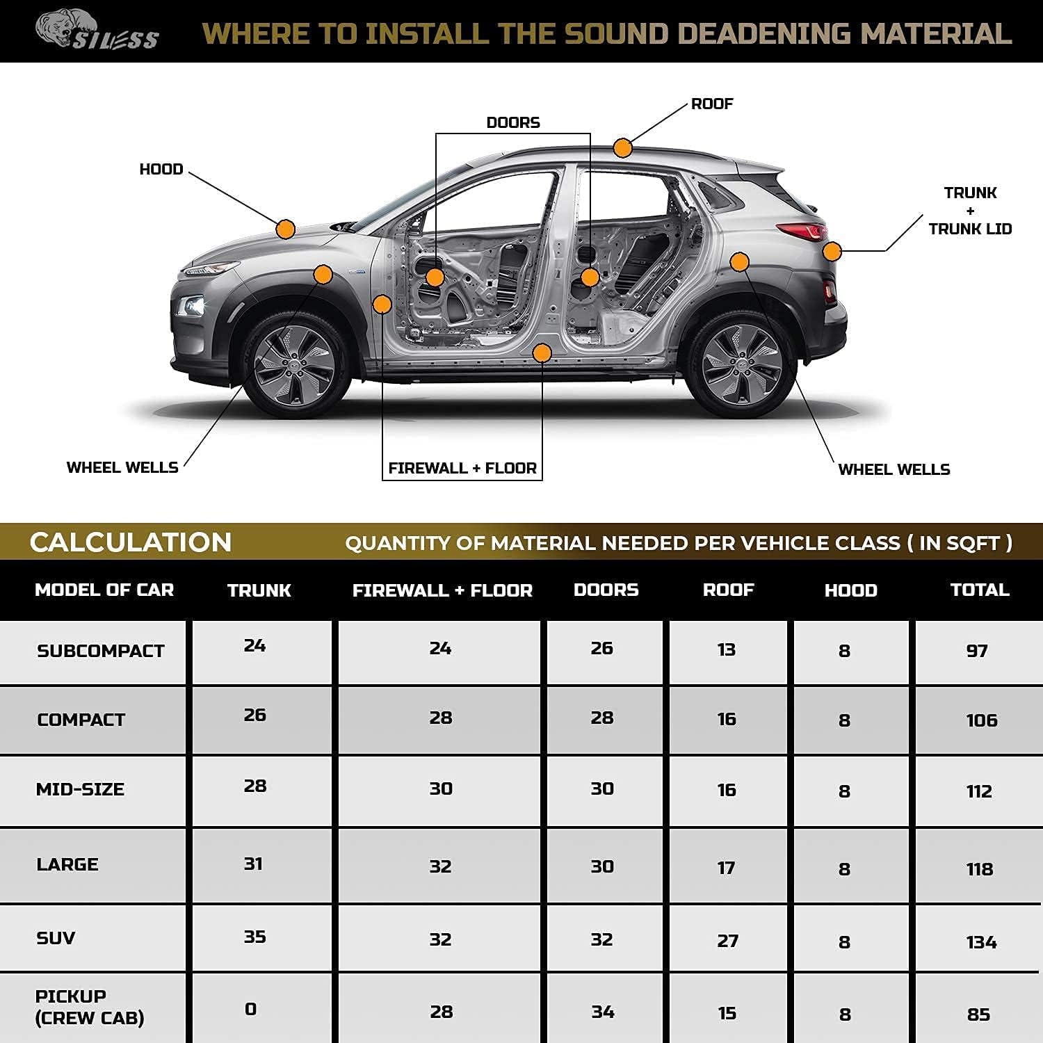 - ★ Ease of Installation — SILESS VIBRO Damping Material is easy to install with a “peel and place” application. Simply trim the pieces to fit, peel and place and hand roll to ensure good adhesion. No messy spray-on paints or adhesives are needed to install this product.