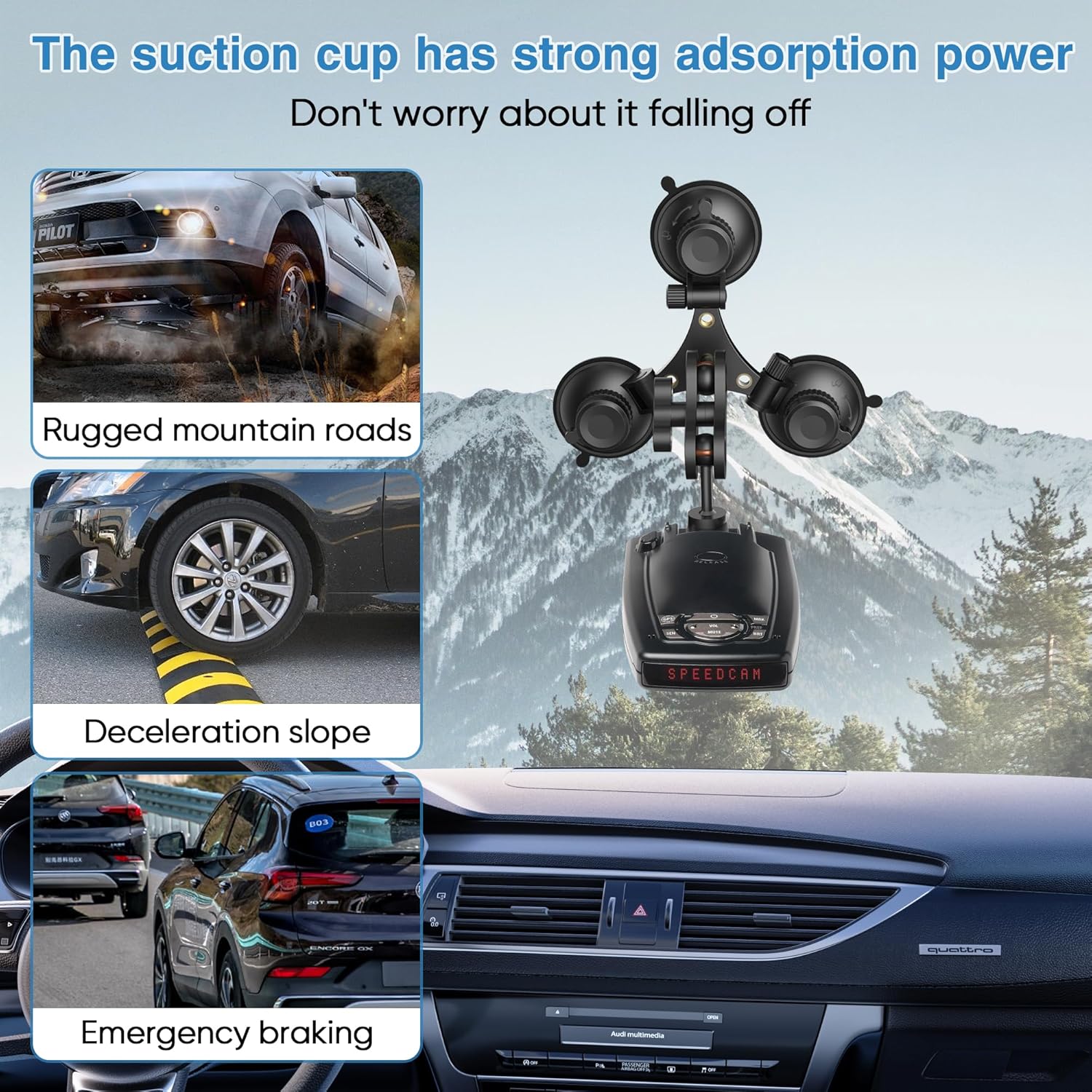 - HIGH QUALITY BRACKET Say goodbye to plastic brackets that are prone to falling off when exposed to high temperatures. Our triangular suction cup car mounted radar bracket is made of all aluminum alloy and has undergone anodizing treatment to improve corrosion resistance and wear resistance. No matter on rugged mountain roads, deceleration slopes, or sudden braking, there will be no shaking during driving, ensuring safety and stability without worrying about falling off