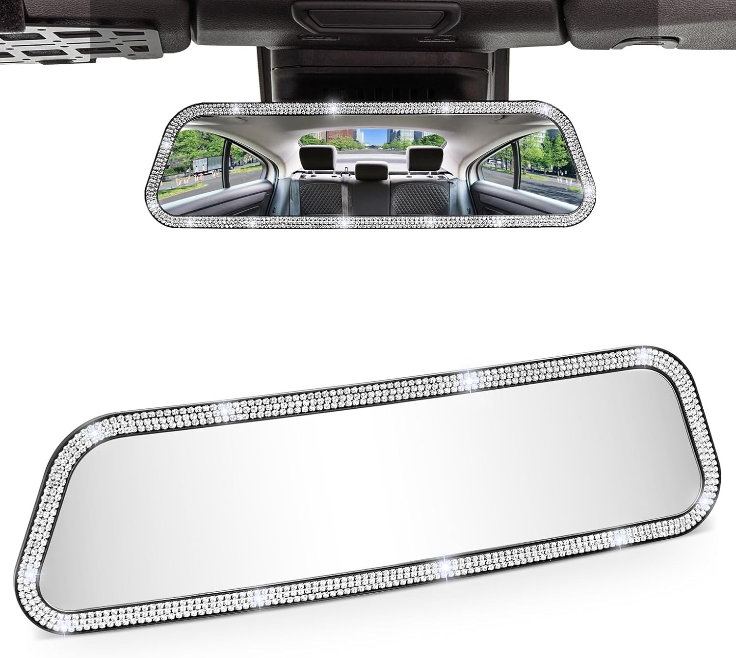 - HIGH QUALITY: The interior rearview mirror is made of high-definition glass providing you with perfect visibility and clear & and real images, No more overlapped or distorted images anymore. Car Rear View Mirror Cover is made from high-quality plastic and bling rhinestones, shining like a diamond. About packaging, use a carton to protect the mirror, and poam paper can prevent scratches on the mirror's surface