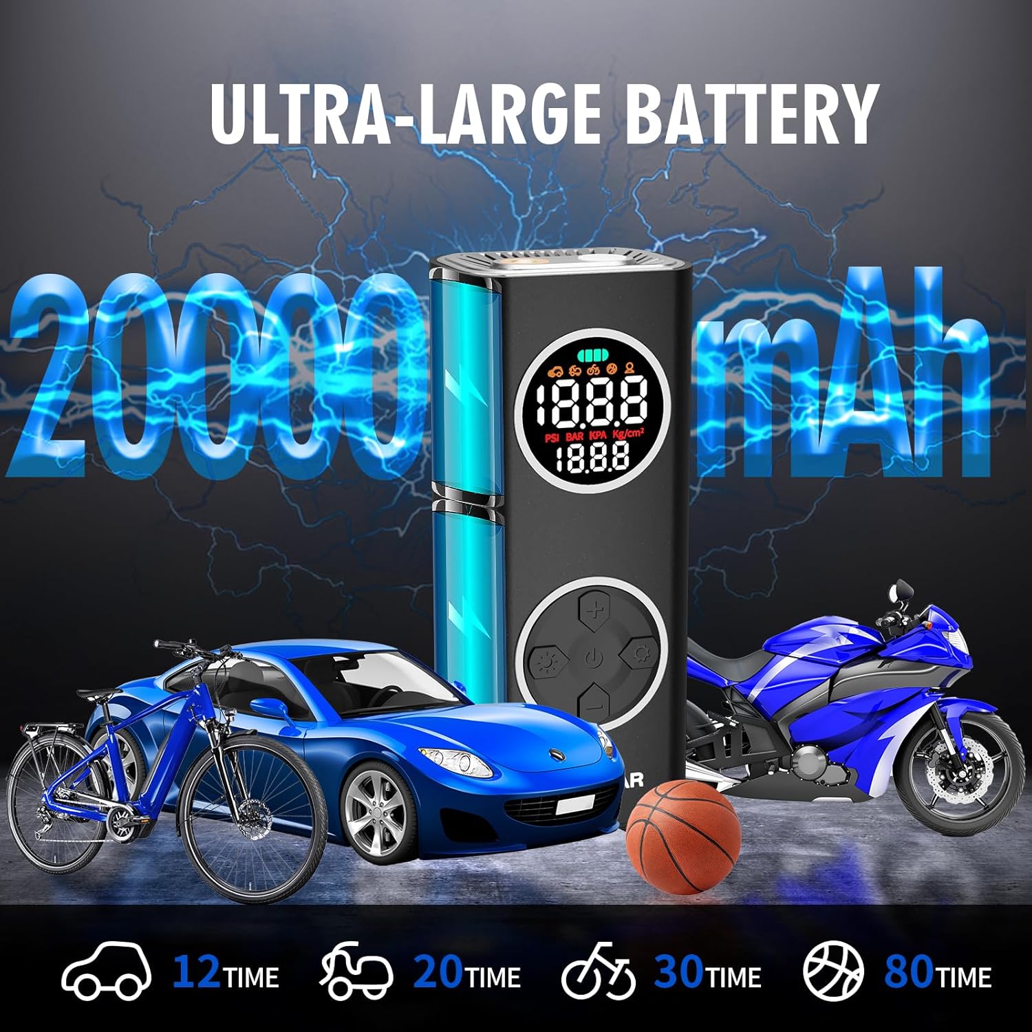 - 【Powerful Cordless and Corded Air Inflation Pump】The air tire inflator built-in 20000mA rechargeable battery cordless and 12v dc power cord, the inflation speed is 3 times faster than other ordinary cordless inflators on the market, with a 35% increase in power, offering cordless and effortless inflation for a wide range of applications including cars, bicycles, sports equipment, and motorcycles, with a maximum pressure of 150PSI, it ensures efficient inflation, eliminating the need for manual labor and keeping your tires road-ready