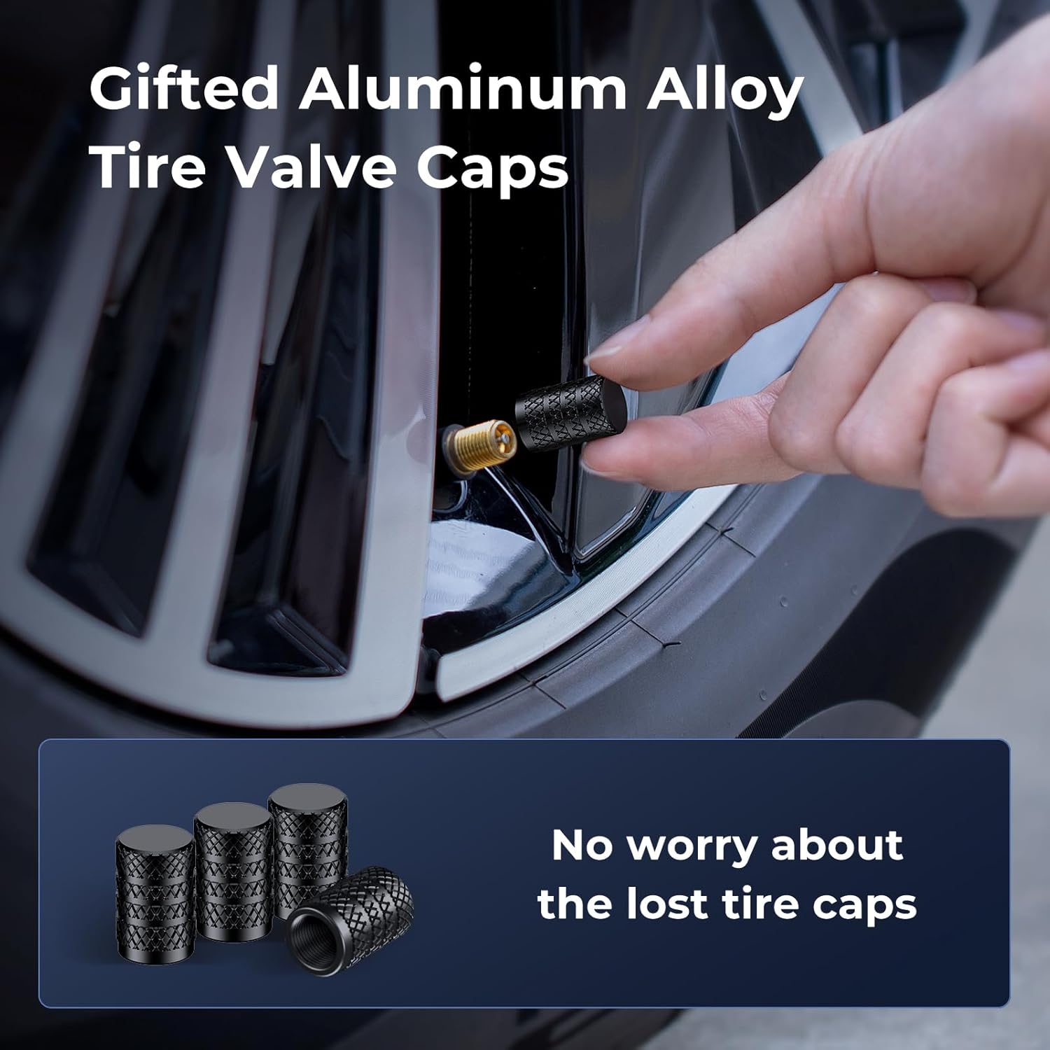 - 【Gifted Car Tire Valve Caps】- Syncwire air pump comes with a comprehensive set of accessories, including multiple inflation nozzles for various demands. Additionally, we provide a unique bonus of four high-quality aluminum alloy car tire valve caps, which are special and unique in the market. Should you ever misplace the original caps for your vehicle's tires, these supplied tire valve caps serve as an excellent substitute, sparing you the embarrassment of lost valve caps.