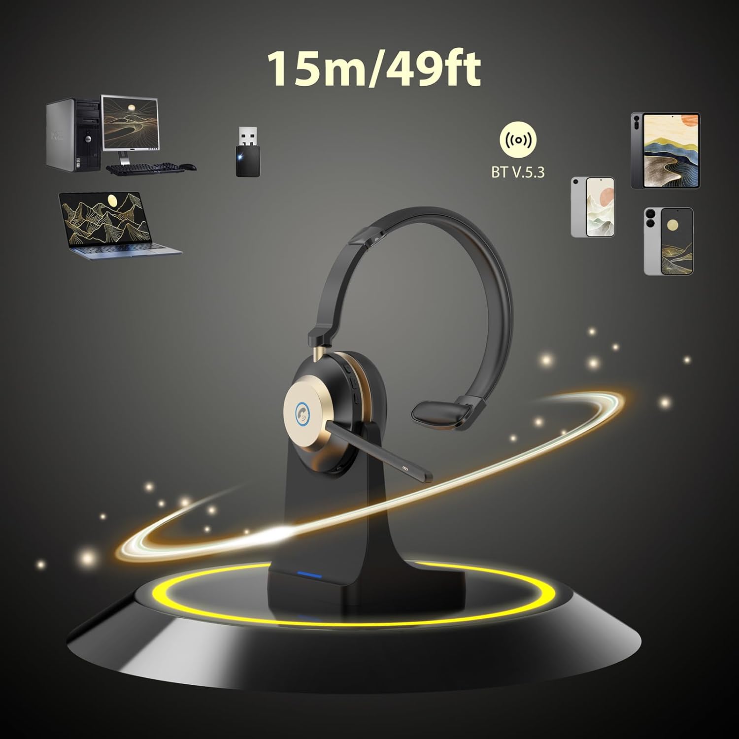 V5.3 Wireless Headset with Mic for Work, 45Hrs Computer Headset with Microphone, Bluetooth Headphones with Noise Cancelling Mic, Charging Base, USB Dongle & Mute Button for PC, Skype, Zoom