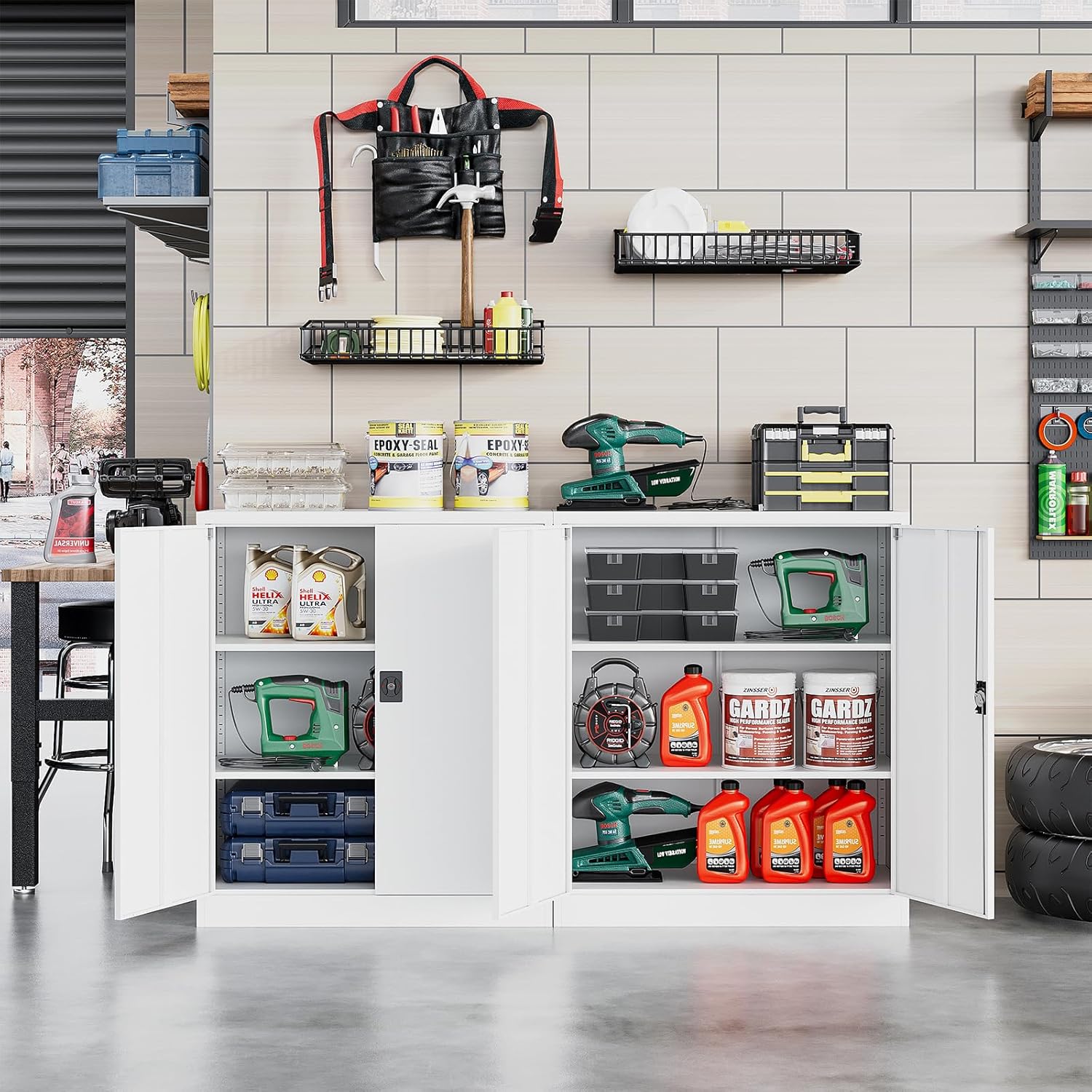 - 【Large Storage Capacity】: The size of the metal storage cabinet is 35.5" H × 31.5" W × 15.8" D. With 2 adjustable shelves, the steel cabinet is divided into 3 layers, with larger storage space suitable for storing office papers, garage tools and household items.