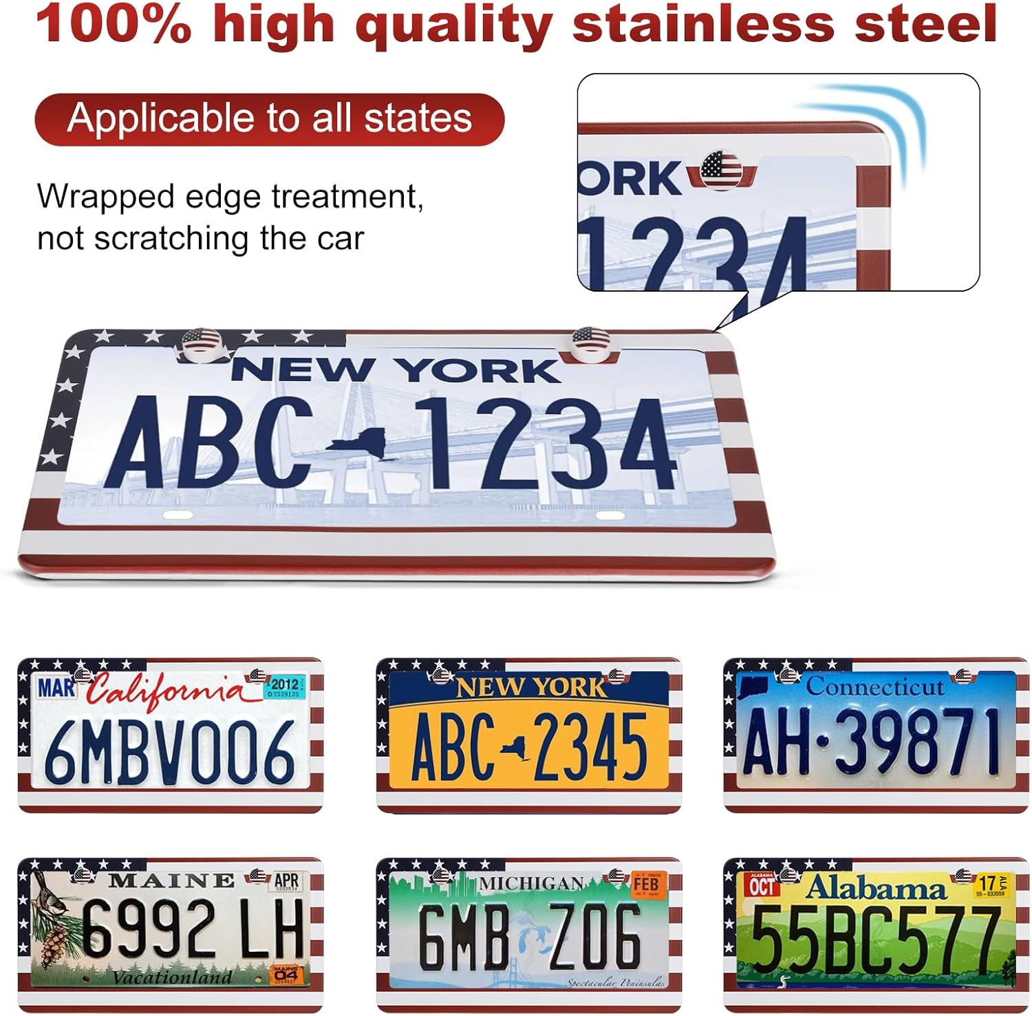 - THE NEW STYLE DOES NOT COVER THE STATE NAME: The upgraded style of the license plate frame is more suitable, and the size of 12.2inch*6.3inch meets the US and Canada standards. The license plate frame is covered with arcs, and the corners are finely polished to prevent scratches on the car paint and protect the license plate from warping and bending.