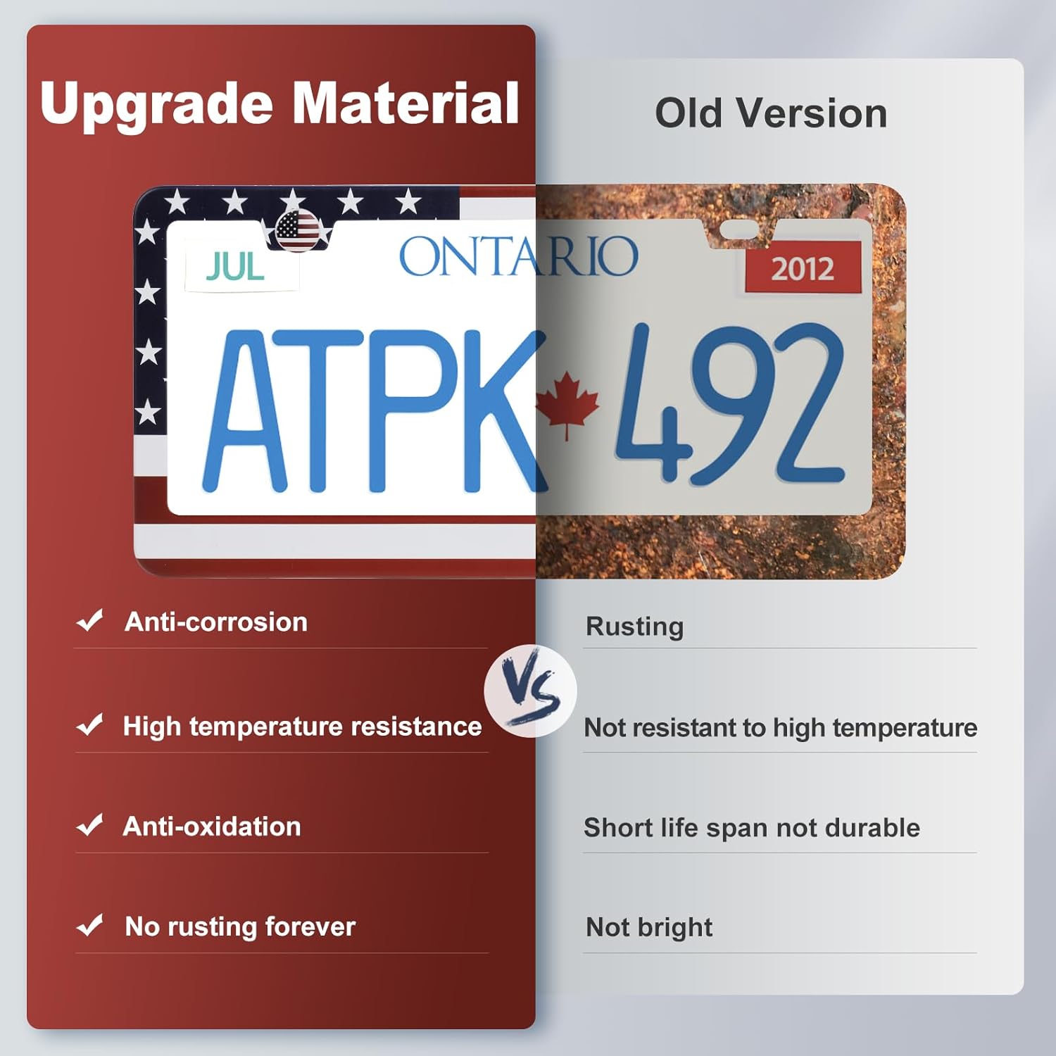 - STAINLESS STEEL LICENSE PLATE FRAME: The main characteristics are no rust, corrosion resistance, air and steam resistance. Wear-resistant, waterproof, not afraid of high temperature, easy to deal with all kinds of bad weather, avoid light pollution, easy to maintain.