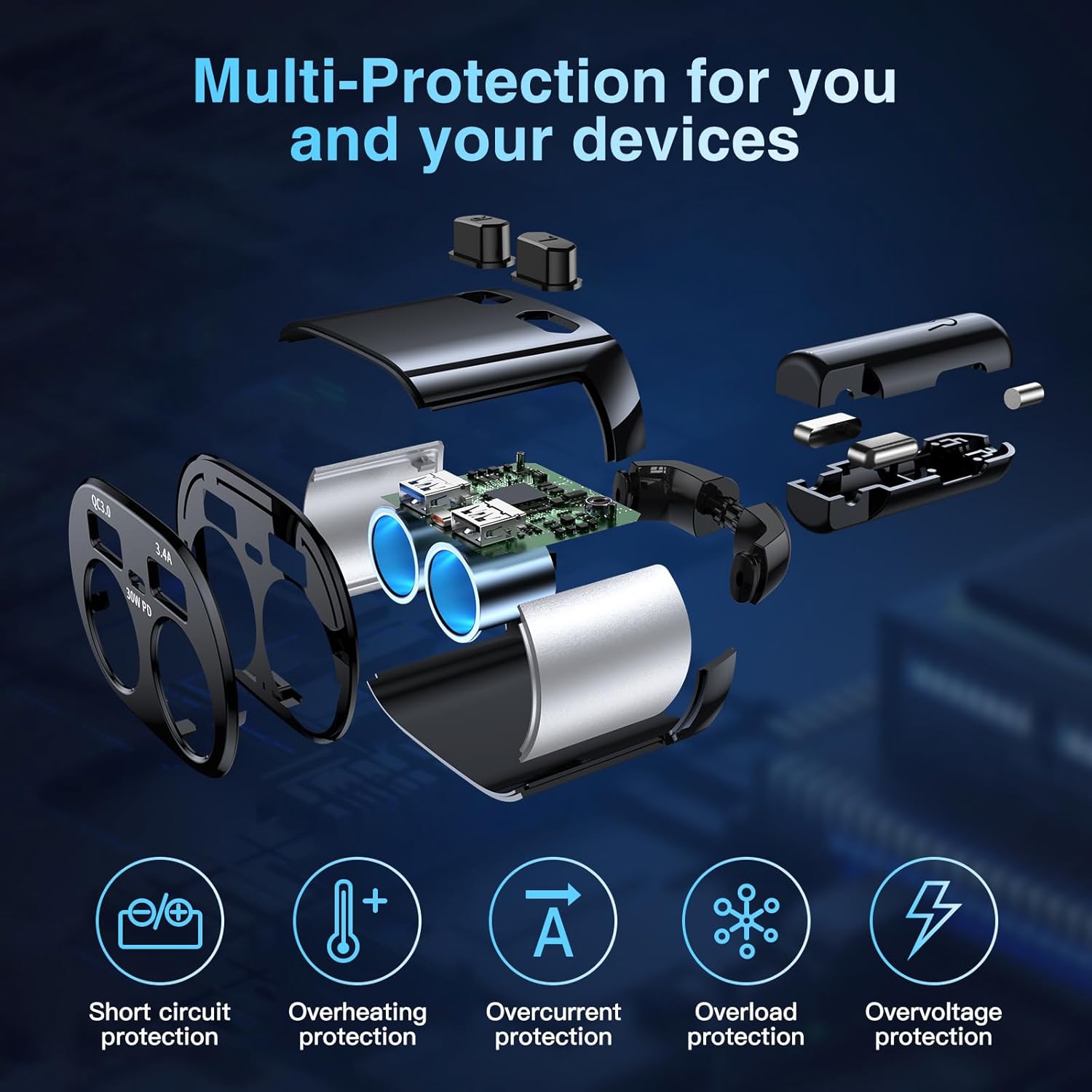 - 【4X FASTER Charging & FREE 30W Type-C Cable】double cigarette lighter adapter. The car charger multiple ports has 1 Type-C charging port and 2 USB-A charging ports, enable you to charge 3 devices simultaneously. FREE 30W USB C to USB C Fast Charging data cable for iPhone 15/15 pro, MacBook, iPad, Samsung Galaxy S24/23. PD30W & QC3.0 ports provide 4X faster than 2.4A car charger. The 30W PD port supports charging for iPhone 15 60% in 25 minutes, and iPad air5 60% in 38 minutes. The QC3.0 port can charge most Android devices from 0% to 80% in 30 minutes. NOTE: (Lightning Cable not included) dual car charger adapter