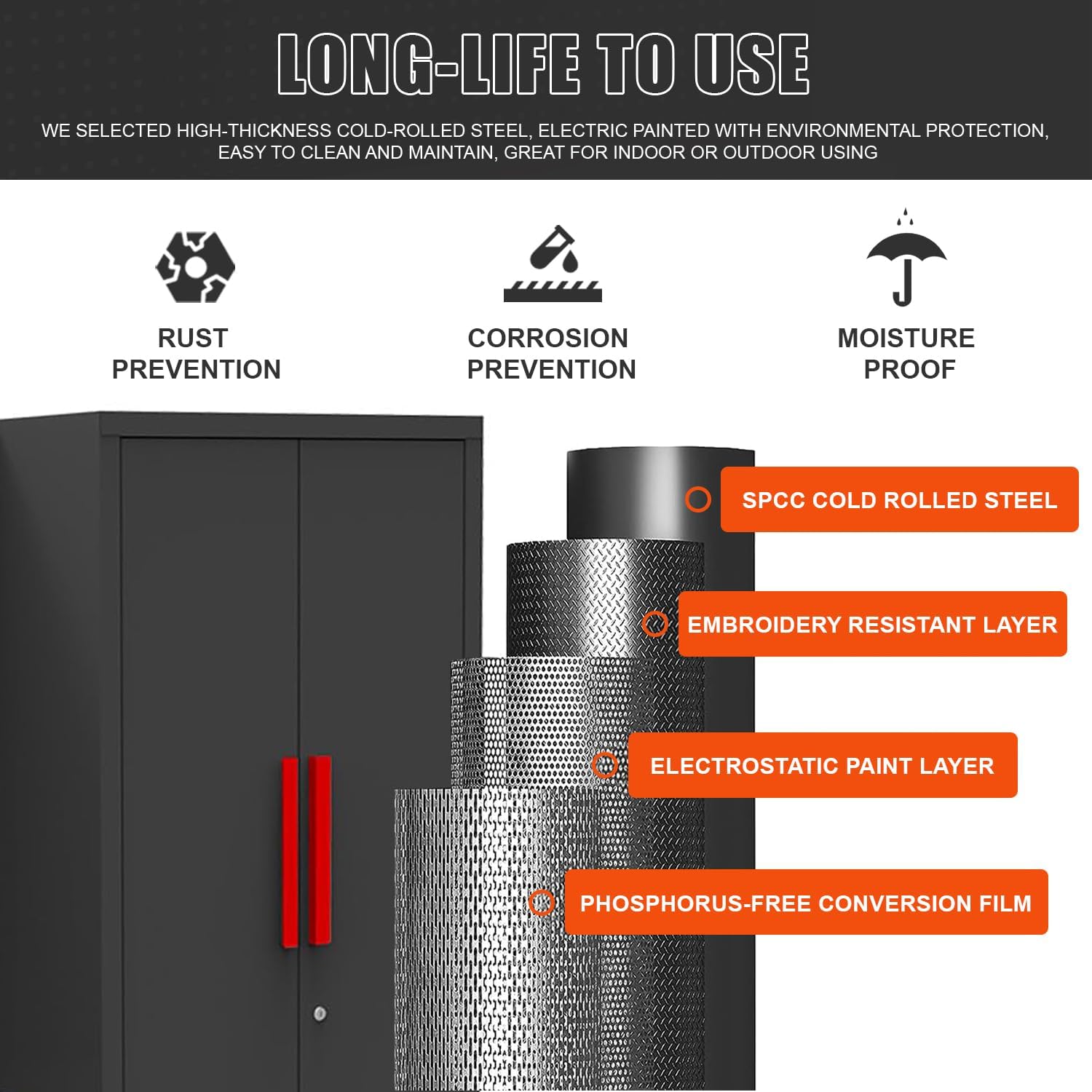 - Tool Organization: HPDMC Garage Storage Cabinet System is specifically designed for garage tool organization. It provides dedicated storage solutions for tools, ensuring that they are easily accessible and well-organized. The system features a black and red color scheme, adding a stylish and visually appealing touch to your garage or workshop