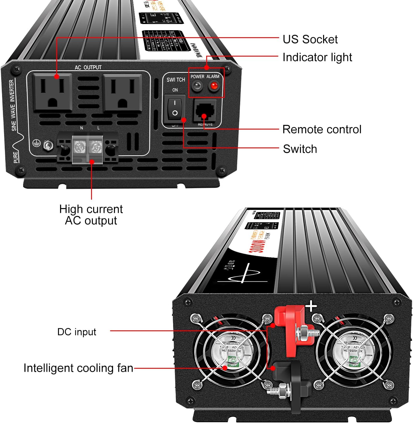 - [True Pure Sine Wave Power Inverter] True rated continuous 3000Watts pure sine wave output power and 6000 Watts peak power.LED display.Perfects for off-grid system,Lower THD,Less wear,Strong inductive Loads Capability.It has little interference with radios, communication and precision equipment.It's also recommended by most cordless tool manufacturer that a pure sine wave inverter is used to ensure long battery life.