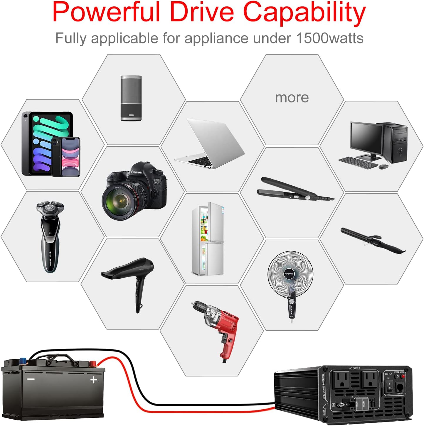 - [True Pure Sine Wave Power Inverter] True rated continuous 1500Watts pure sine wave output power and 3000 Watts peak power.LED display.Perfects for off-grid system,Lower THD,Less wear,Strong inductive Loads Capability.It has little interference with radios, communication and precision equipment.It's also recommended by most cordless tool manufacturer that a pure sine wave inverter is used to ensure long battery life.